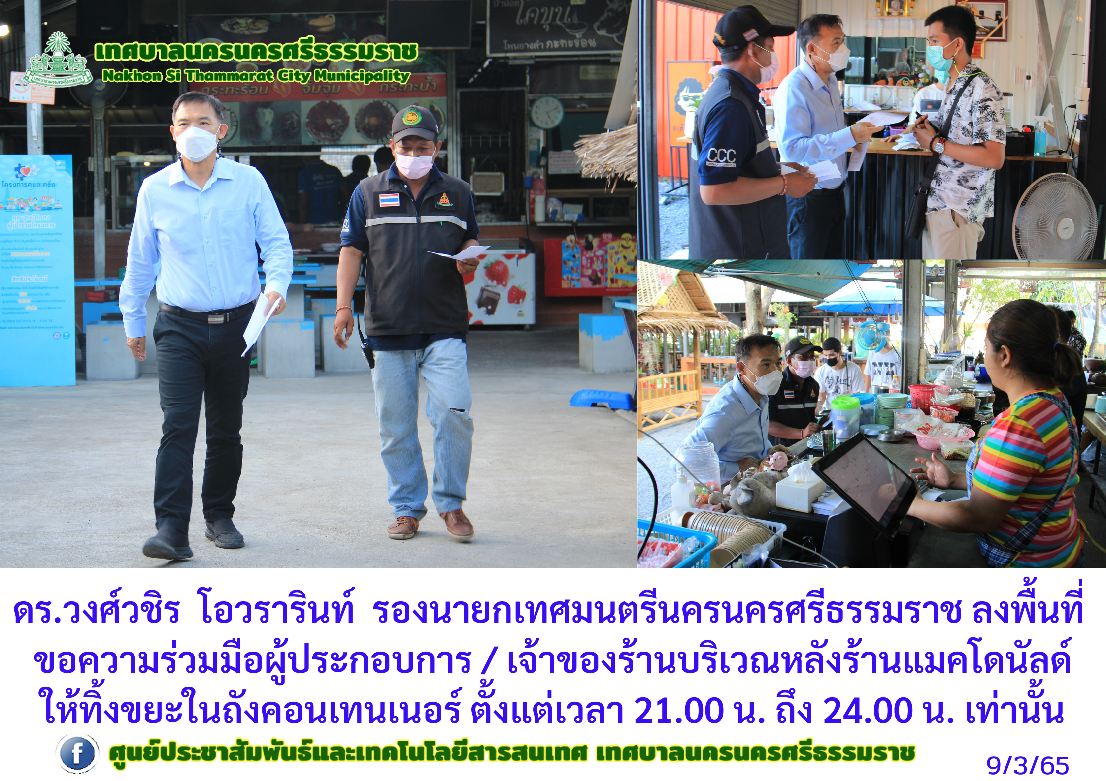 วันพุธ ที่ 9 มีนาคม 2565 เวลา 17.00 น. ดร.วงศ์วชิร โอวรารินท์ รองนายกเทศมนตรีนครนครศรีธรรมราช ร่วมกับ เจ้าหน้าที่กองสาธารณสุขและสิ่งแวดล้อมเทศบาลนครนครศรีธรรมราช รถประชาสัมพันธ์ ลงพื้นที่ ขอความร่วมมือผู้ประกอบการ / เจ้าของร้านบริเวณหลังร้านแมคโดนัลด์ ให้ทิ้งขยะในถังคอนเทนเนอร์ ตั้งแต่เวลา 21.00 น. ถึง 24.00 น. เท่านั้น ตามโครงการ "ถนนปลอด ถังขยะ " เพื่อความสะอาดและความเป็นระเบียบเรียบร้อยของบ้านเมือง |