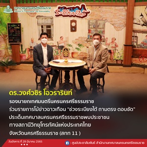 วันอังคาร ที่ 29 มีนาคม 2565 เวลา 16.00 น. ดร.วงศ์วชิร โอวรารินท์ รองนายกเทศมนตรีนครนครศรีธรรมราช ร่วมรายการโม้ข่าวฉาวเทือน "ช่วงระเบียงใต้ "ถามตรง ตอบชัด ประเด็นเทศบาลนครนครศรีธรรมราชพบประชาชน ทางสถานีวิทยุโทรทัศน์แห่งประเทศไทย จังหวัดนครศรีธรรมราช (สทท 11 ) โดยรองนายกเทศมนตรีฯได้กล่าวในรายการถึง กองสาธารณสุขและสิ่งแวดล้อมเทศบาลนครนครศรีธรรมราช ดำเนินการ จัดกิจกรรมรณรงค์รักษาความสะอาดในโครงการ “ ถนนปลอดถังขยะ ” ทั้งนี้ กองสาธารณสุขและสิ่งแวดล้อม เทศบาลนครนครศรีธรรมราช ได้ดำเนินการถึงบริเวณถนนกะโรม ตลอดสาย โดยให้ประชาชน ผู้ประกอบการ เริ่มทิ้งขยะ ในเวลา 18.00 น - 20.00 น. เริ่มตั้งแต่วันที่ 15 มีนาคม 2565 เป็นต้นไป
