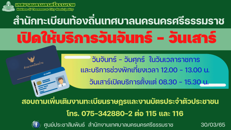เทศบาลนครนครศรีธรรมราช โดยงานทะเบียนราษฎรและงานบัตรประจำตัวประชาชนเปิดให้บริการวันจันทร์ - วันเสาร์ |