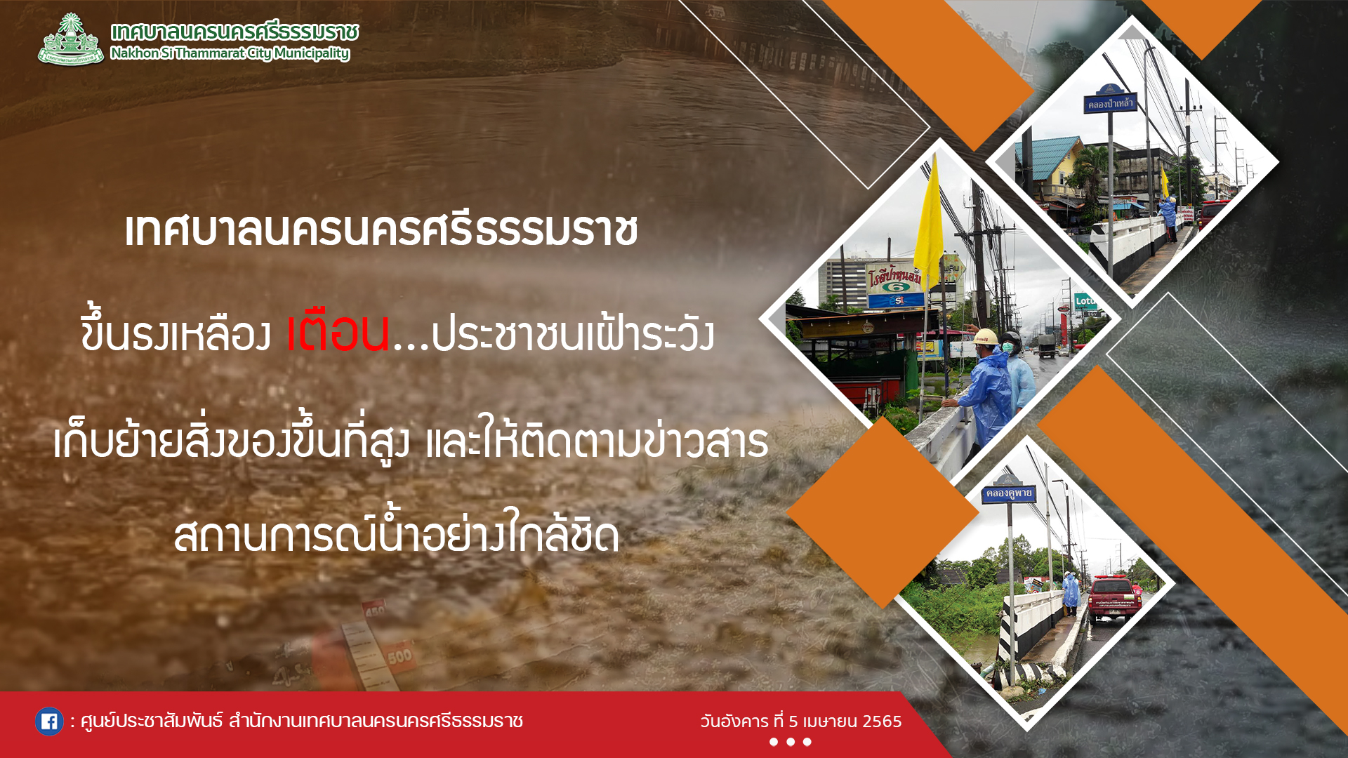 เทศบาลนครนครศรีธรรมราช ภายใต้การนำของ ดร.กณพ เกตุชาติ นายกเทศมนตรีนครนครศรีธรรมราช ได้ดำเนินการติดตั้งป้ายพร้อมปักธงสัญลักษณ์แจ้งเตือนภัย ณ สะพานข้ามคลอง ที่ผ่านเขตเทศบาล เพื่อให้ประชาชนได้สังเกต และเตรียมพร้อมรับสถานการณ์น้ำท่วมและน้ำล้นตลิ่ง ซึ่งในขณะนี้ เกิดฝนตกหนักในพื้นที่และมีปริมาณน้ำสะสมในคลองต่างๆ เพิ่มขึ้นอย่างต่อเนื่อง จึงได้ใช้สัญลักษณ์ธงสีเหลือง ซึ่งหมายถึง ระดับน้ำต่ำกว่าตลิ่ง น้อยกว่า 1.50 เมตร ให้ติดตามข่าวสารอย่างใกล้ชิด และเตือนประชาชนเฝ้าระวัง เก็บย้ายสิ่งของขึ้นที่สูง