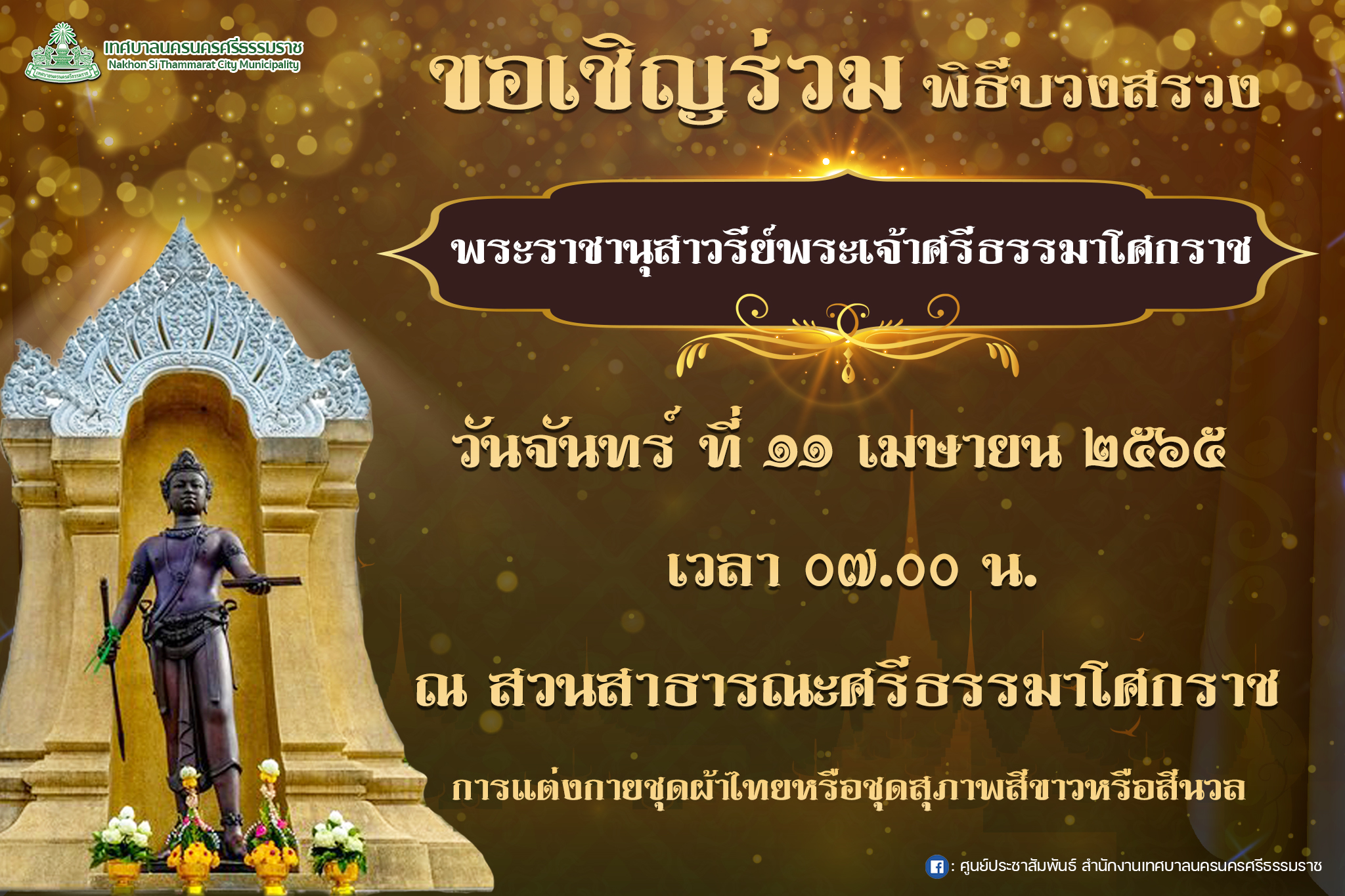 เทศบาลนครนครศรีธรรมราช ขอเชิญประชาชนร่วมพิธีบวงสรวงพระราชานุสาวรีย์พระเจ้าศรีธรรมาโศกราช |