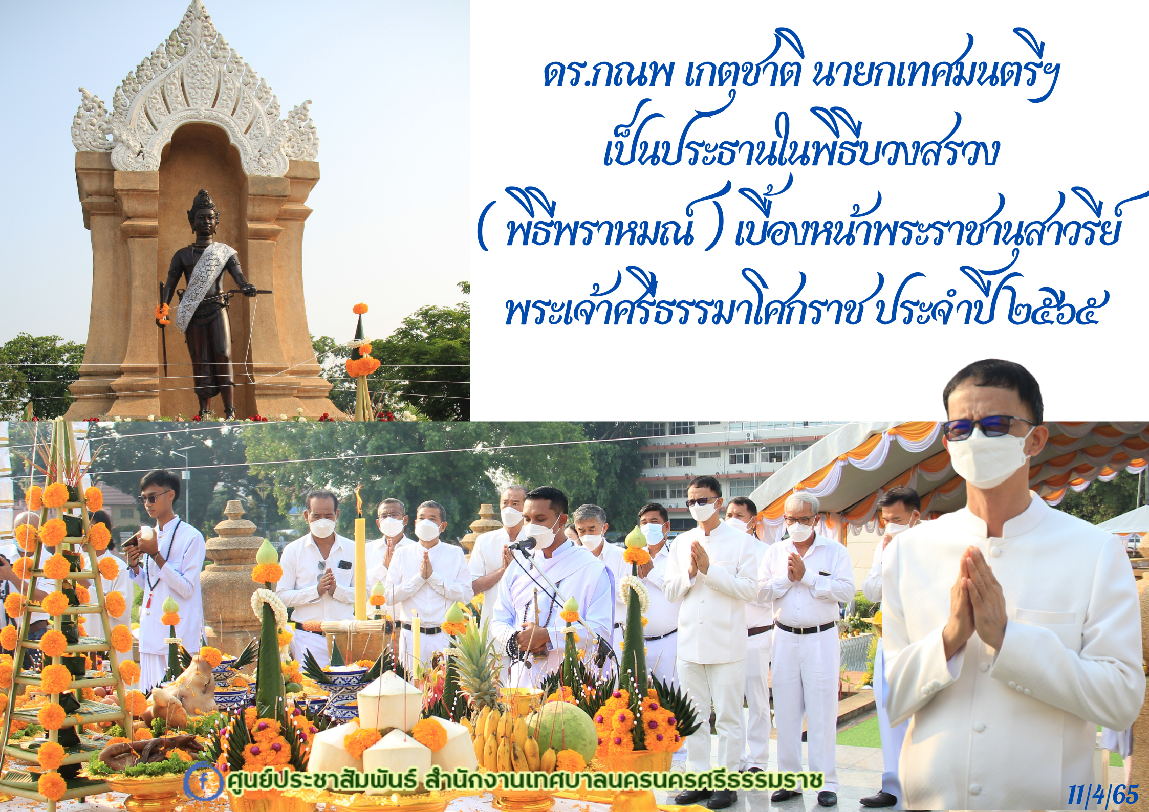 วันจันทร์ ที่ 11 เมษายน 2565 เวลา 07.19 น. ณ สวนสาธารณะศรีธรรมาโศกราช ดร.กณพ เกตุชาติ นายกเทศมนตรีนครนครศรีธรรมราช เป็นประธานในพิธีบวงสรวง ( พิธีพราหมณ์ ) เบื้องหน้าพระราชานุสาวรีย์ พระเจ้าศรีธรรมาโศกราช ประจำปี 2565 ซึ่ง วันที่ 11 เมษายน ของทุกปี กำหนดให้เป็นวัน “ พระเจ้าศรีธรรมาโศกราช ” เนื่องจากเป็นวันคล้ายวันประดิษฐานพระราชานุสาวรีย์ พระเจ้าศรีธรรมาโศกราช และเพื่อเป็นการรำลึกถึงพระกรุณาธิคุณของพระเจ้าศรีธรรมาโศกราช โดย มีคณะผู้บริหาร สมาชิกสภาเทศบาลนครนครศรีธรรมราช หัวหน้าส่วนราชการ พนักงานเทศบาล ลูกจ้างในสังกัดเทศบาลนครนครศรีธรรมราชและประชาชน เข้าร่วมพิธีในครั้งนี้ ทั้งนี้ พิธีดังกล่าว จัดงานภายใต้มาตรการควบคุมและป้องกันโรคติดเชื้อไวรัสโคโรนา 2019 ( Covid-19 ) อย่างเคร่งครัด