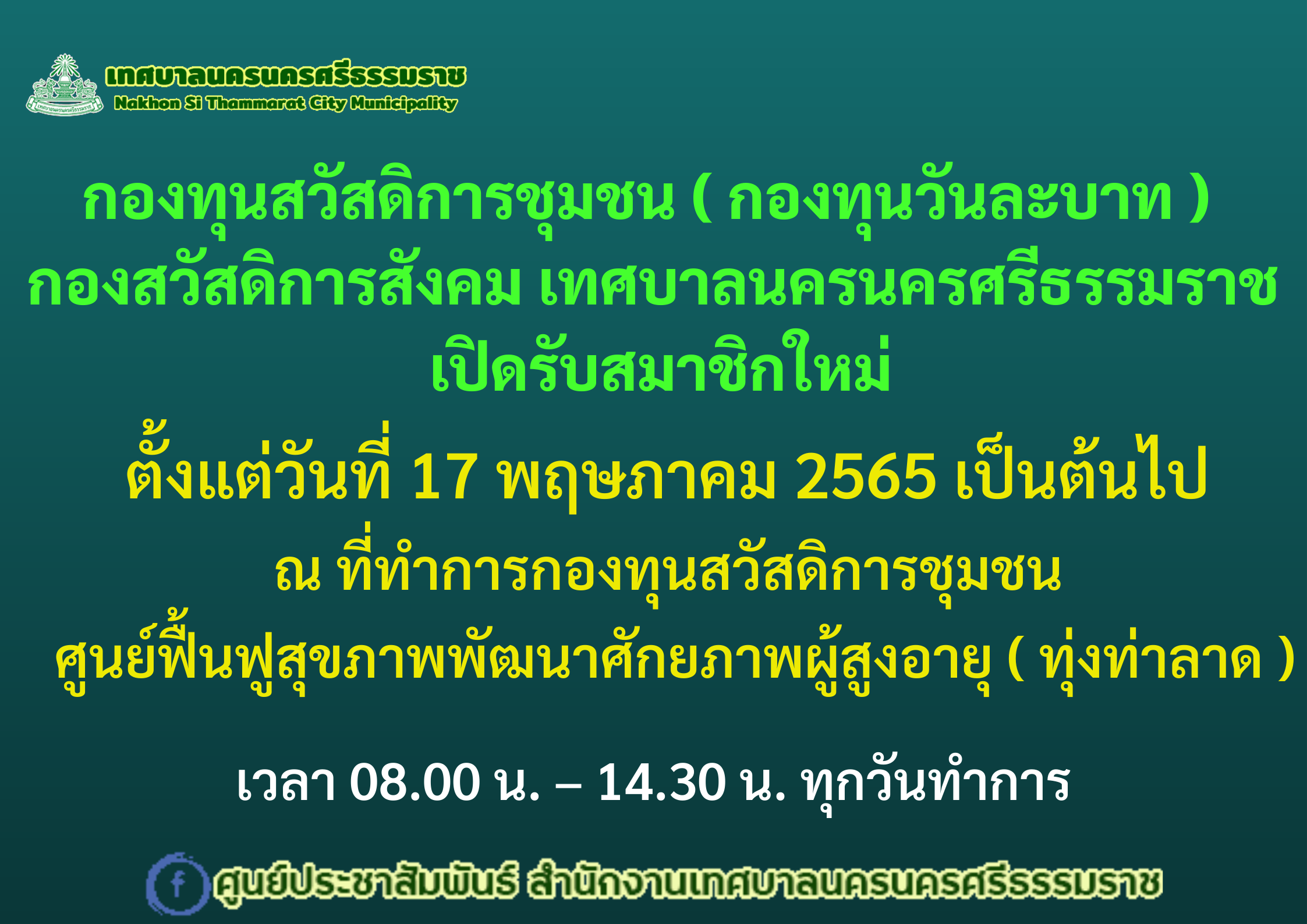 กองทุนสวัสดิการชุมชน ( กองทุนวันละบาท ) เทศบาลนครนครศรีธรรมราช เปิดรับสมาชิกใหม่ |