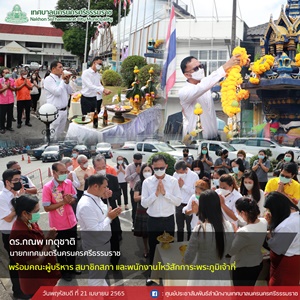 วันพฤหัสบดี ที่ 21 เมษายน 2565 เวลา 09.00 น. ณ สำนักงานเทศบาลนครนครศรีธรรมราช ดร.กณพ เกตุชาติ นายกเทศมนตรีนครนครศรีธรรมราช พร้อมด้วย คณะผู้บริหาร สมาชิกสภา และพนักงานเทศบาล ไหว้สักการะพระภูมเจ้าที่ประจำเทศบาลนครนครศรีธรรมาราช เพื่อความเจริญรุ่งเรื่อง และเป็นสิริมงคล ในการทำงาน
