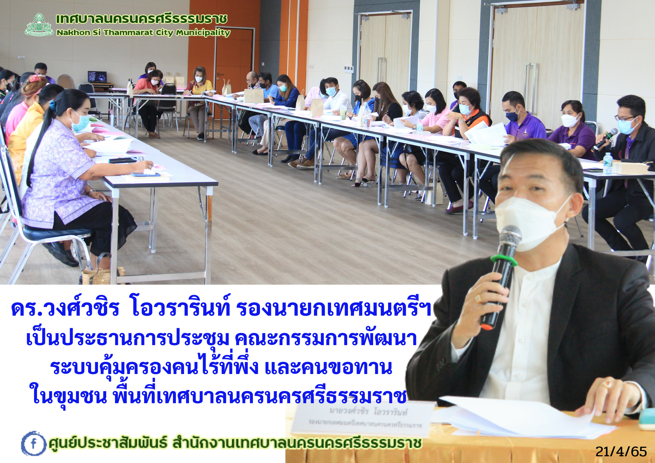 ดร.วงศ์วชิร โอวรารินท์ รองนายกเทศมนตรีนครนครศรีธรรมราช เป็นประธานการประชุม คณะกรรมการพัฒนาระบบคุ้มครองคนไร้ที่พึ่ง และคนขอทานในขุมชน พื้นที่เทศบาลนครนครศรีธรรมราช โครงการขับเคลื่อนการดำเนินงานตามบันทึกข้อตกลงว่าด้วยความร่วมมือการพัฒนาระบบคุ้มครองคนไร้ที่พึ่งและขอทานในชุมชน ร่วมกับเทศบาลนครนครศรีธรรมราช ประจำปีงบประมาณ 2565 |
