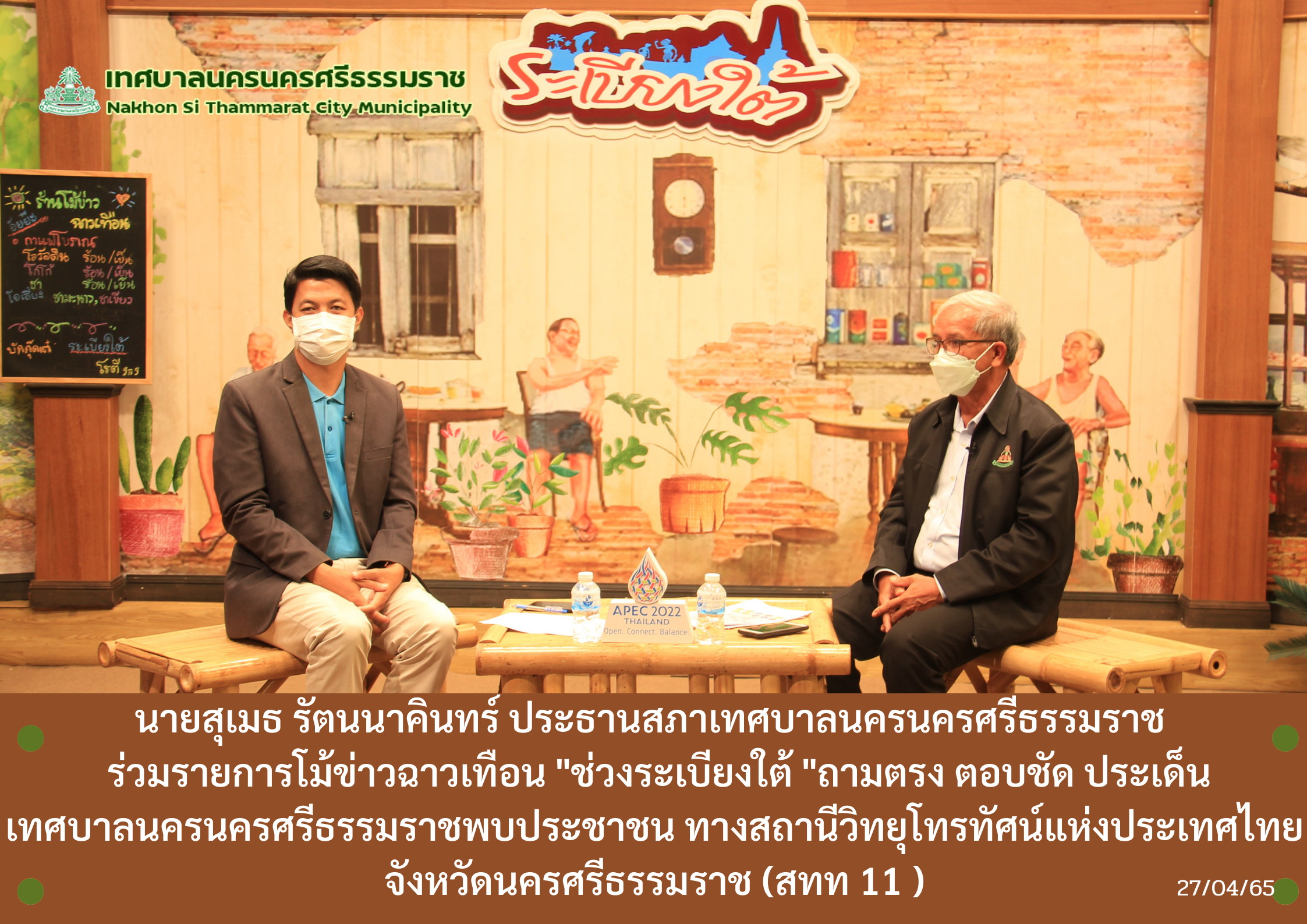 วันพุธ ที่ 27 เมษายน 2565 เวลา 16.00 น. นายสุเมธ รัตนนาคินทร์ ประธานสภาเทศบาลนครนครศรีธรรมราช ร่วมรายการโม้ข่าวฉาวเทือน "ช่วงระเบียงใต้ "ถามตรง ตอบชัด ประเด็นเทศบาลนครนครศรีธรรมราชพบประชาชน ทางสถานีวิทยุโทรทัศน์แห่งประเทศไทย จังหวัดนครศรีธรรมราช (สทท 11 ) โดยสนทนาในรายการถึง อำนาจหน้าที่ของสภาเทศบาลนครนครศรีธรรมราช การดำเนินงานของสมาชิกสภาเทศบาลนครนครศรีธรรมราช การมีส่วนร่วมต่างๆ สามารถติดตามการออกอากาศได้ใน 17.30 น. ทางสถานีโทรทัศน์แห่งประเทศไทย ช่อง 11 นครศรีธรรมราช |