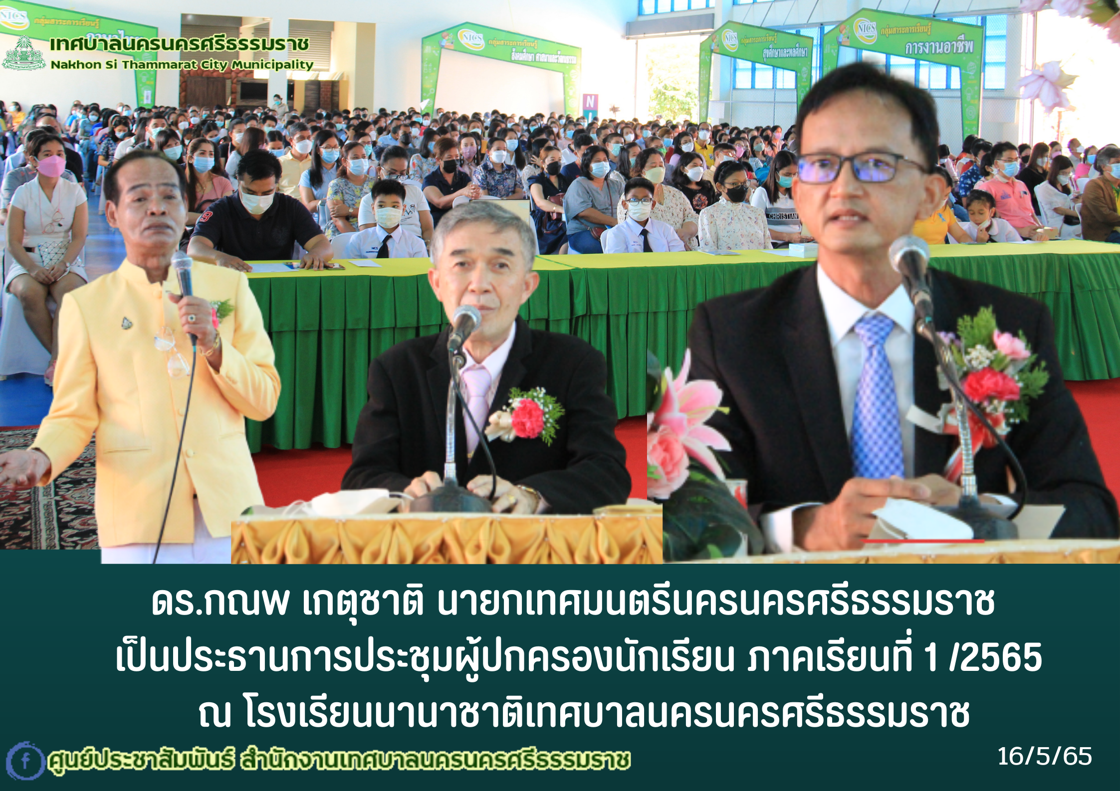 จันทร์ ที่ 16 พฤษภาคม พ.ศ. 2565 เวลา 09.00 น. ณ อาคารอเนกประสงค์ โรงเรียนนานาชาติเทศบาลนครนครศรีธรรมราช ดร.กณพ เกตุชาติ นายกเทศมนตรีนครนครศรีธรรมราช เป็นประธานการประชุมผู้ปกครองนักเรียน ภาคเรียนที่ 1 /2565 พร้อมมอบนโยบายทางด้านการศึกษา โดยมี ดร.ภาวินทร์ ณ พัทลุง รองนายกเทศมนตรีนครนครศรีธรรมราช และ นายชาคร ไอยศูรย์ ปลัดเทศบาล พบปะ ผู้ปกครองถึงแนวทางการจัดการศึกษาของเทศบาลฯ การจัดประชุมดังกล่าว มีวัตถุประสงค์