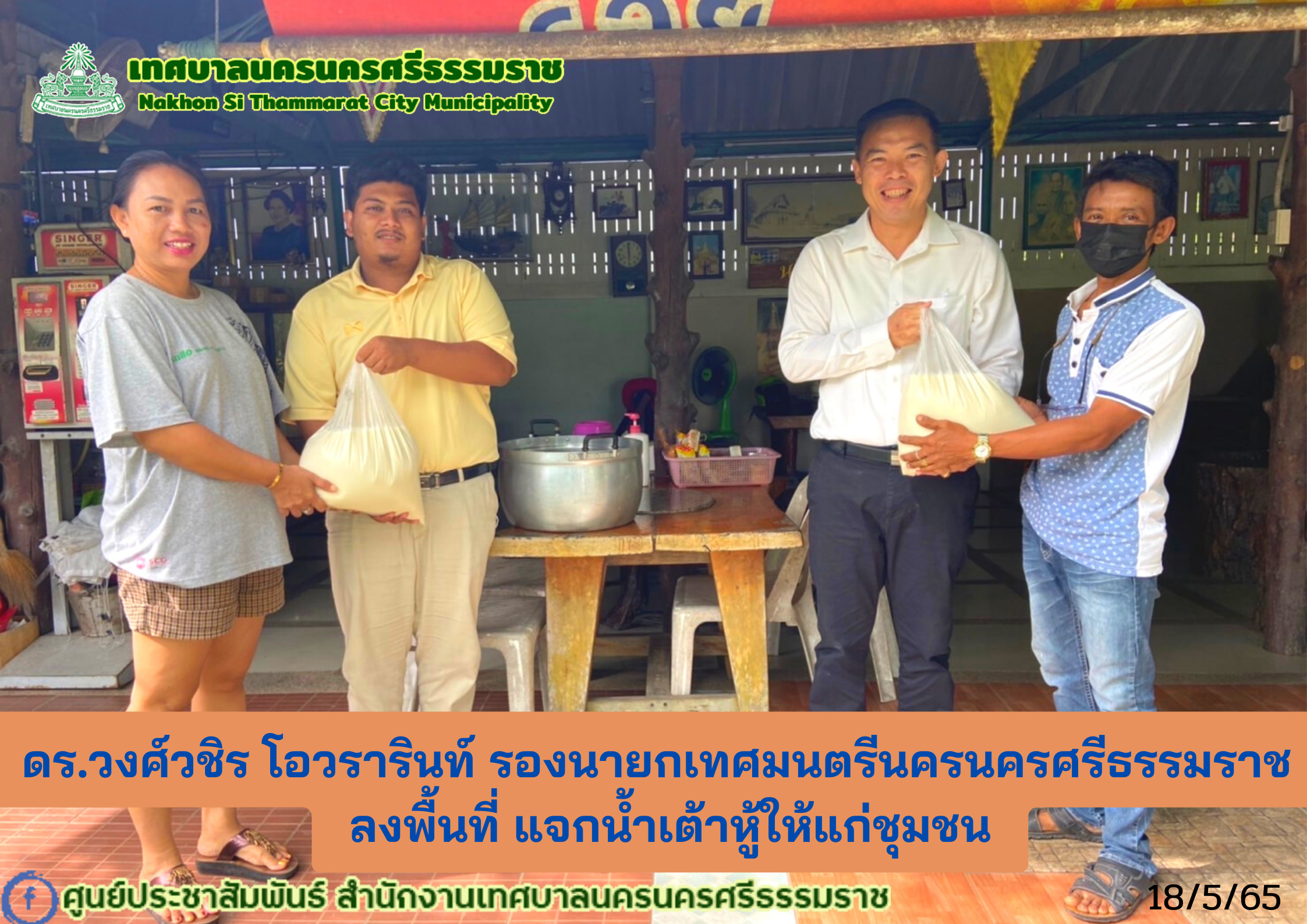 ดร.วงศ์วชิร โอวรารินท์ รองนายกเทศมนตรีนครนครศรีธรรมราช เป็นตัวแทน เทศบาลนครนครศรีธรรมราช ลงพื้นที่ แจกน้ำเต้าหู้ให้แก่ชุมชน |