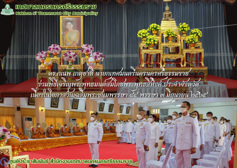 ดร.กณพ เกตุชาติ นายกเทศมนตรีนครนครศรีธรรมราช ร่วมพิธีเจริญพระพุทธมนต์สมโภชพระพุทธสิหิงค์ ประจำจังหวัด เนื่องในโอกาสวันเฉลิมพระชนมพรรษา ๔๔ พรรษา สมเด็จพระนางเจ้าสุทิดา พัชรสุธาพิมลลักษณ พระบรมราชินี |