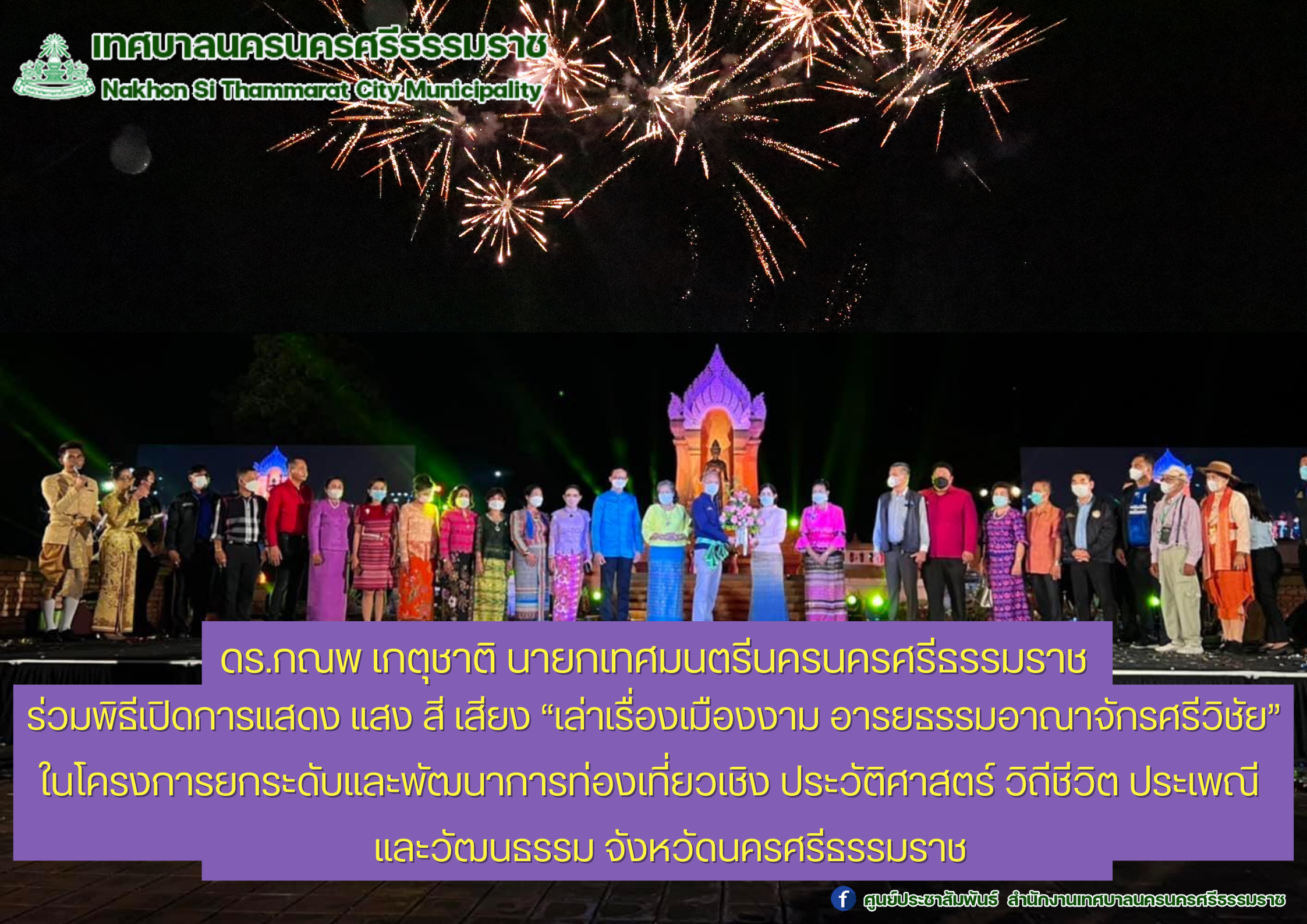 วันเสาร์ที่ 4 มิถุนายน 2565 เวลา 19.00 น. ณ สวนสาธารณะศรีธรรมโศกราช ดร.กณพ เกตุชาติ นายกเทศมนตรีนครนครศรีธรรมราช ร่วมพิธีเปิดการแสดง แสง สี เสียง “เล่าเรื่องเมืองงาม อารยธรรมอาณาจักรศรีวิชัย” ในโครงการยกระดับและพัฒนาการท่องเที่ยวเชิงประวัติศาสตร์ วิถีชีวิต ประเพณี และวัฒนธรรม จังหวัดนครศรีธรรมราช โดยมีนางเรืองอุไร บุญช่วยชูพันธ์ุ รองผู้ว่าราชการจังหวัดนครศรีธรรมราช กล่าวรายงานถึงวัตถุประสงค์การจัดงานต่อประธานในพิธี นายพิพัฒน์ รัชกิจประการ รัฐมนตรีว่าการกระทรวงท่องเที่ยวและกีฬา ซึ่งมีหน่วยงานจากหลายภาคส่วนในจังหวัดนครศรีธรรมราชเข้าร่วม สำหรับการจัดงานดังกล่าวเป็นการขับเคลื่อนด้านเศรษฐกิจ เพื่อฟื้นฟูเศรษฐกิจการท่องเที่ยวของจังหวัดนครศรีธรรมราช โดยใช้อัตลักษณ์ของจังหวัดดึงดูดนักท่องเที่ยว หลังสถานการณ์โควิด-19 เริ่มคลี่คลาย ทั้งนี้ การจัดกิจกรรมจะมีขึ้นระหว่างวันที่ 3-5 มิถุนายน 2565 ณ สวนสาธารณะศรีธรรมาโศกราช