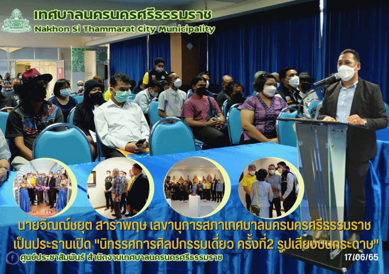 นายจิณณ์ชยุต สาราพฤษ เลขานุการสภาเทศบาลนครนครศรีธรรมราช เป็นประธานเปิด “นิทรรศการศิลปกรรมเดี่ยว ครั้งที่2 รูปเสียงบนกระดาษ” โดยชูเกียรติ สุทิน |