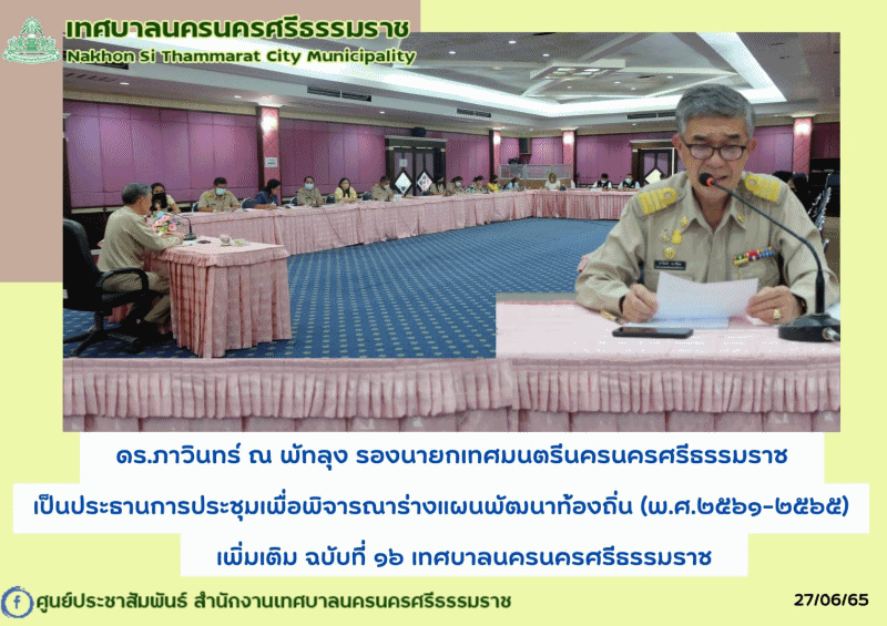 ดร.ภาวินทร์ ณ พัทลุง รองนายกเทศมนตรีนครนครศรีธรรมราช เป็นประธานการประชุมพิจารณาร่างแผนพัฒนาท้องถิ่น (พ.ศ.2561 – 2565) เพิ่มเติม ฉบับที่ 16 เทศบาลนครนครศรีธรรมราช |
