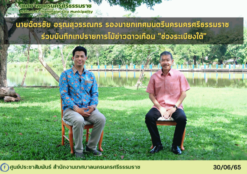 วันพฤหัสบดี ที่30 มิถุนายน 2565 ณ สวนสมเด็จพระศรีนครินทร์ 84 (ทุ่งท่าลาด) นายฉัตรชัย อรุณสุวรรณกร รองนายกเทศมนตรีนครนครศรีธรรมราช ร่วมบันทึกเทปรายการโม้ข่าวฉาวเทือน “ช่วงระเบียงใต้” ประเด็นโครงการนครสามธรรม เฟส2 เทศบาลนครนครศรีธรรมราช โดยสำนักช่าง มีโครงการปรับปรุงภูมิทัศน์ดังนี้