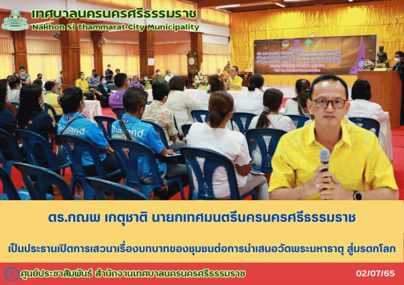ดร.กณพ เกตุชาติ นายกเทศมนตรีนครนครศรีธรรมราช เป็นประธานเปิดการเสวนาเรื่องบทบาทของชุมชนต่อการนำเสนอวัดพระมหาธาตุ สู่มรดกโลก |