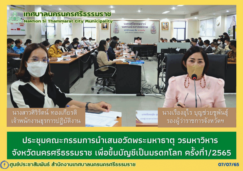 นางสาวศิริรัตน์ ทองเกียรติ เจ้าพนักงานธุรการปฏิบัติงาน ร่วมประชุมคณะกรรมการนำเสนอวัดพระมหาธาตุ วรมหาวิหาร จังหวัดนครศรีธรรมราช เพื่อขึ้นบัญชีเป็นมรดกโลก ครั้งที่1/2565 |