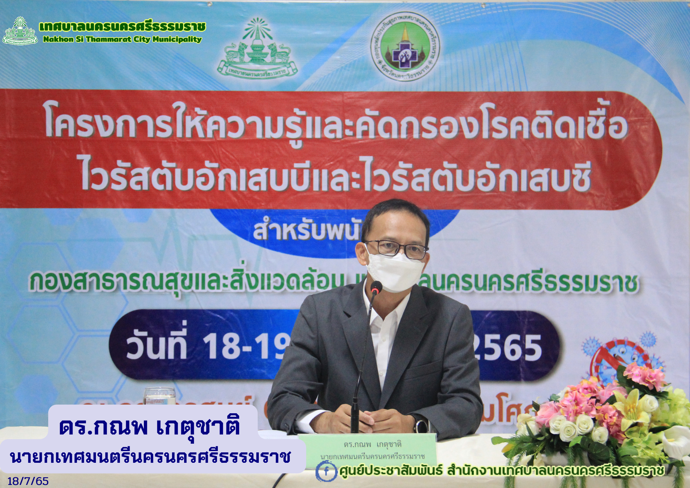 ดร.กณพ เกตุชาติ นายกเทศมนตรีนครนครศรีธรรมราช เป็นประธาน เปิด “โครงการให้ความรู้และคัดกรองโรคติดเชื้อไวรัสตับอักเสบบีและไวรัสตับอักเสบซี สำหรับพนักงานกองสาธารณสุขและสิ่งแวดล้อม ” |