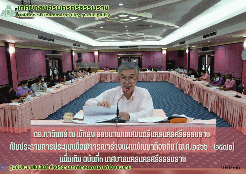 ดร.ภาวินทร์ ณ พัทลุง รองนายกเทศมนตรีนครนครศรีธรรมราช เป็นประธานการประชุมเพื่อพิจารณาร่างแผนพัฒนาท้องถิ่น (พ.ศ.2566 – 2570) เพิ่มเติม ฉบับที่ 3 เทศบาลนครนครศรีธรรมราช |