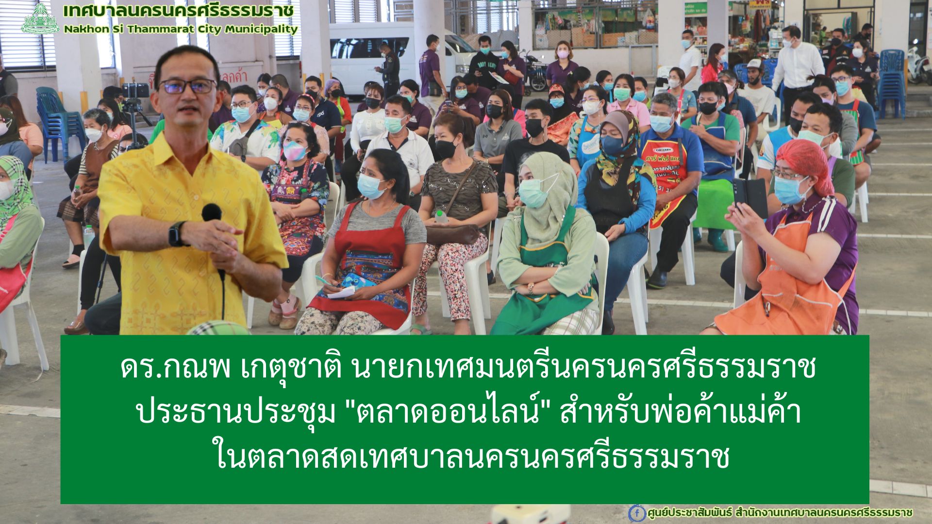 วันพุธ ที่ 20 กรกฎาคม 2565 เวลา 09.00 น. ณ บริเวณลานจอดรถชั้น 2 ตลาดสดเทศบาลนครนครศรีธรรมราช ดร.กณพ เกตุชาติ นายกเทศมนตรีนครนครศรีธรรมราช เป็นประธานการประชุม "ตลาดออนไลน์สำหรับพ่อค้าแม่ค้า"ในตลาดสดเทศบาลนครนครศรีธรรมราช เพื่อสร้างความรู้ความเข้าใจการใช้งานระบบตลาดออนไลน์ให้กับพ่อค้า แม่ค้าในตลาดสดเทศบาล