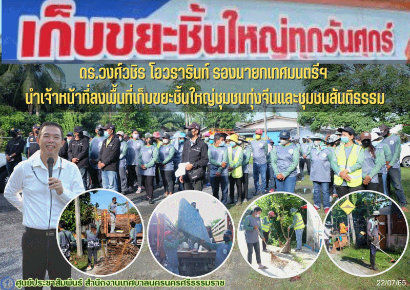 ดร.วงศ์วชิร โอวรารินท์ รองนายกเทศมนตรีนครนครศรีธรรมราช นำสมาชิกสภาเทศบาล เขต 4 และเจ้าหน้าที่กองสาธารณสุขและสิ่งแวดล้อม ลงพื้นที่เก็บขยะชิ้นใหญ่ ชุมชนทุ่งจีนและชุมชนสันติธรรม |