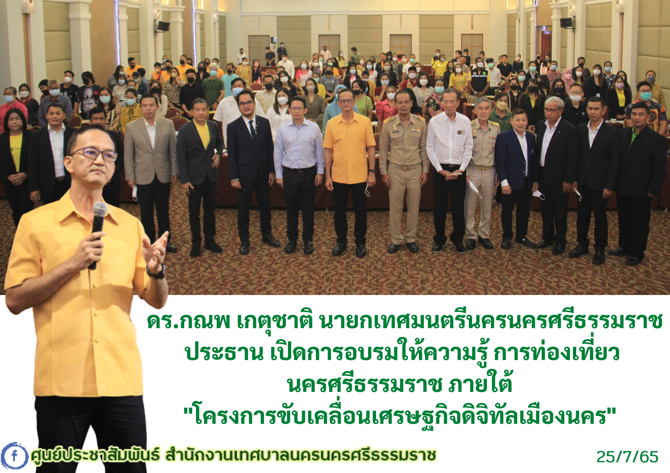 วันจันทร์ ที่ 25 กรกฎาคม 2565 เวลา 09.00 น. ณ ห้องประชุมแก้วกัลยา แกรนด์บอลรูม โรงแรมเมืองลิกอร์ ดร.กณพ เกตุชาติ นายกเทศมนตรีนครนครศรีธรรมราช ประธาน เปิดการอบรมให้ความรู้ การท่องเที่ยวนครศรีธรรมราช ภายใต้ "โครงการขับเคลื่อนเศรษฐกิจดิจิทัลเมืองนคร" โดยมีกลุ่มผู้ประกอบการโรงแรม ร้านค้า ร้านอาหาร สมาคม ชมรมด้านการท่องเที่ยว หน่วยงานภาครัฐ ภาคเอกชนและเจ้าหน้าที่เทศบาลนครนครศรีธรรมราชที่เกี่ยวข้อง เข้าร่วมการฝึกอบรมโครงการ วัตถุประสงค์ เพื่อศึกษาทิศทางในการพัฒนาเศรษฐกิจเทคโนโลยีดิจิทัลของไทยใน ปัจจุบันรวมทั้งแนวโน้มในอนาคต และเพื่อเพิ่มประสิทธิภาพ พัฒนา ทักษะ ความรู้ โดยการนำเทคโนโลยีดิจิทัล มาประยุกต์ใช้ในการประกอบธุรกิจเพื่อเพิ่มรายได้และเพิ่มมูลค่าให้กับสินค้าและบริการ การอบรมดังกล่าว ยังมีการแนะนำให้ผู้เข้าอบรมรู้จักกับ "มิสเตอร์ท่องเที่ยว" สำหรับ อำนวยความสะดวกให้นักท่องเที่ยวที่เดินทางมาท่องเที่ยวในเขตเทศบาลนครนครศรีธรรมราช โดยมีมิสเตอร์ ท่องเที่ยวคอยตอบคำถามและให้คำแนะนำเรื่องต่าง ๆ และอีกหนึ่งระบบ คือ "หลาดเทศบาลออนไลน์" ซึ่งเป็นการเปิดพื้นที่สำหรับผู้ซื้อ ผู้ขาย และผู้ส่งของ ได้มาเจอกัน มีเทศบาลเป็นตัวกลางคอยสนับสนุน โดยการใช้เทคโนโลยีสมัยใหม่ ที่อยู่ภายใต้แพลตฟอร์ม line official ของเทศบาลฯ โดยไม่มีการเก็บค่าใช้จ่ายใดๆ ทั้งนี้ ได้รับเกียรติจาก ดร.นน อัครประเสริฐกุล ผู้เชี่ยวชาญส่งเสริมเศรษฐกิจดิจิทัลอาวุโส ฝ่ายส่งเสริมเมืองอัจฉริยะ พร้อมด้วย คุณพรชัย เอี่ยมสุกใส กรรมการผู้จัดการใหญ่บริษัทสยามอินโนซิตี้จำกัด และ คุณมีธรรม ณ ระนอง รองผู้อำนวยการ สำนักงานพัฒนาธุรกิจรกรรมทางอิเล็คทรอนิกส์ กระทรวงดิจิทัลเพื่อเศรษฐกิจและสังคม เป็นวิทยากรในการอบรมให้ความรู้ในครั้งนี้ ในการนี้ผู้ประกอบการที่สนใจเข้าร่วมหลาดเทศบาลออนไลน์ สามารถลงทะเบียนในระบบได้ที่ไลน์@nakhoncity