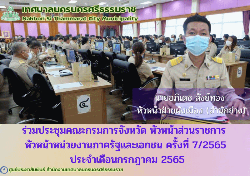 นายอภิเดช สังข์ทอง หัวหน้าฝ่ายผังเมือง (สำนักช่างเทศบาลนครนครศรีธรรมราช) ร่วมประชุมคณะกรมการจังหวัด หัวหน้าส่วนราชการ หัวหน้าหน่วยงานภาครัฐและเอกชน ครั้งที่ 7/๒๕๖๕ ประจำเดือนกรกฎาคม ๒๕๖๕ |