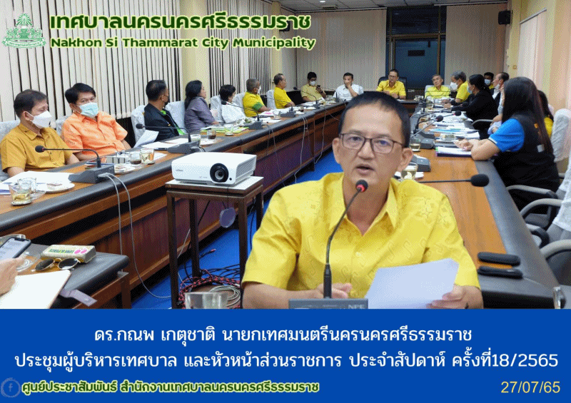 วันพุธ ที่ 27 กรกฎาคม พ.ศ. 2565 เวลา 10.00. น. ณ ห้องประชุมเทศบาลนครนครศรีธรรมราช ชั้น2 ดร.กณพ เกตุชาติ นายกเทศมนตรีนครนครศรีธรรมราช ประชุมผู้บริหารเทศบาล หัวหน้าส่วนราชการ ประจำสัปดาห์ ครั้งที่ 18/2565 เพื่อติดตามผลการปฎิบัติราชการดังนี้ ระเบียบวาระที่ 1 เรื่องแจ้งให้ที่ประชุมทราบ 1.1 การบริหารจัดการขยะ ระเบียบวาระที่ 2 เรื่องรับรองรายงานการประชุม รับรองรายงานการประชุมผู้บริหารเทศบาล และหัวหน้าส่วนราชการ ประจำวันพุธของสัปดาห์ ครั้งที่ 17/2565 เมื่อวันพุธที่ 6 กรกฎาคม 2565 เวลา 10.00 น. ณ ห้องประชุมเทศบาลนครนครศรีธรรมราช (ชั้น 2) ระเบียบวาระที่ 3 เรื่องติดตามผลการปฏิบัติราชการ เรื่องที่ 1 งานจิตอาสาพัฒนาคลอง วันที่ 6 สิงหาคม 2565 (สำนักปลัดเทศบาล, กองสวัสดิการสังคม) เรื่องที่ 2 งานจิตอาสาในวันสำคัญของชาติ วันที่ 10 สิงหาคม 2565 (สำนักปลัดเทศบาล, กองสวัสดิการสังคม)