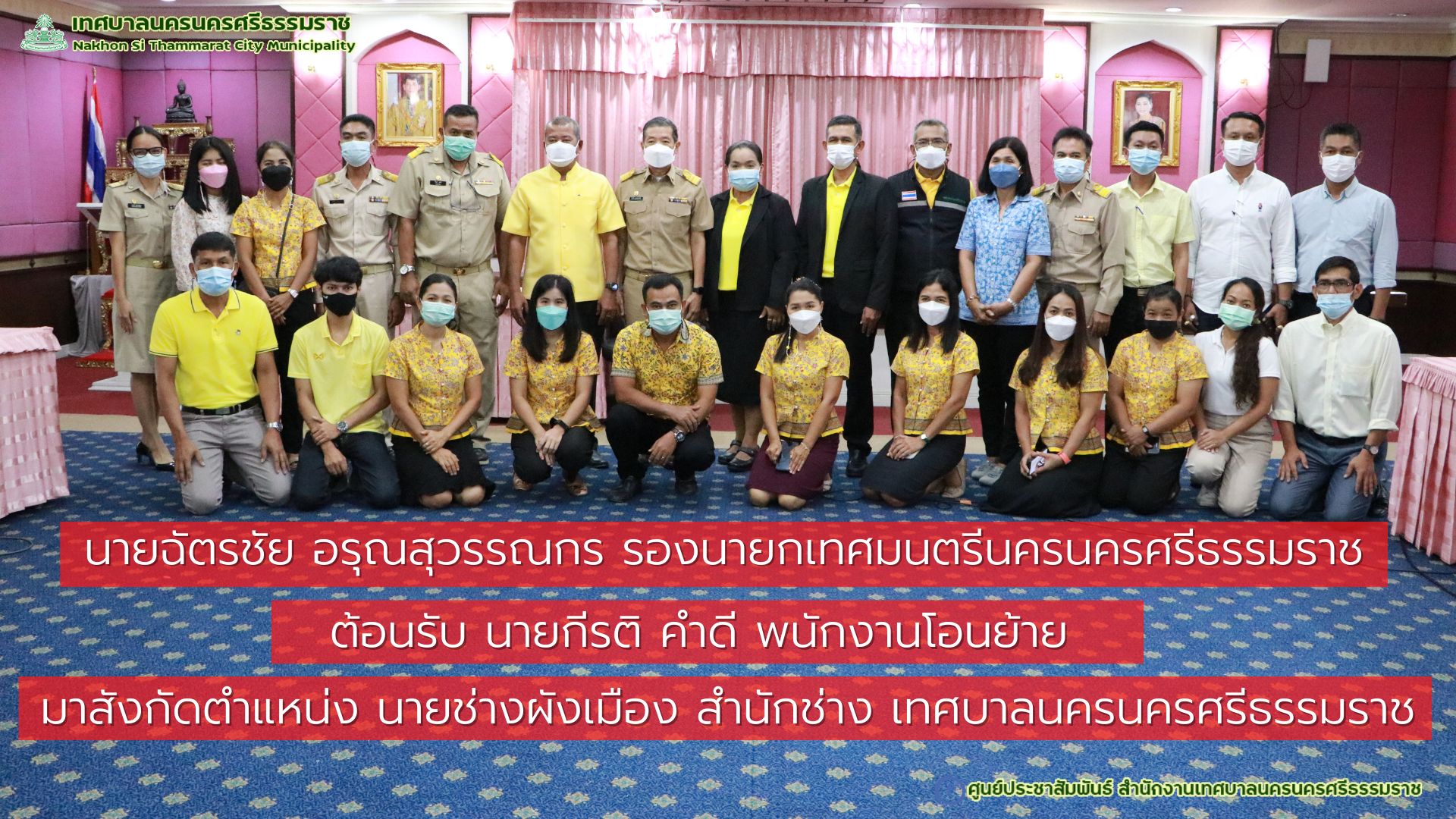 วันจันทร์ ที่ 1 สิงหาคม 2565 เวลา 10.00 น. ณ ห้องประชุมเทศบาลนครนครศรีธรรมราช (ชั้น5) นายฉัตรชัย อรุณสุวรรณกร รองนายกเทศมนตรีนครนครศรีธรรมราช พร้อมหัวหน้าส่วนราชการ และพนักงานสำนักช่าง ต้อนรับ นายกีรติ คำดี พนักงานโอนย้าย จากเทศบาลตำบลพรหมคีรี พร้อมคณะ มา สังกัดตำแหน่ง นายช่างผังเมือง ส่วนควบคุมการก่อสร้างอาคารและผังเมือง สำนักช่าง เทศบาลนครนครศรีธรรมราช