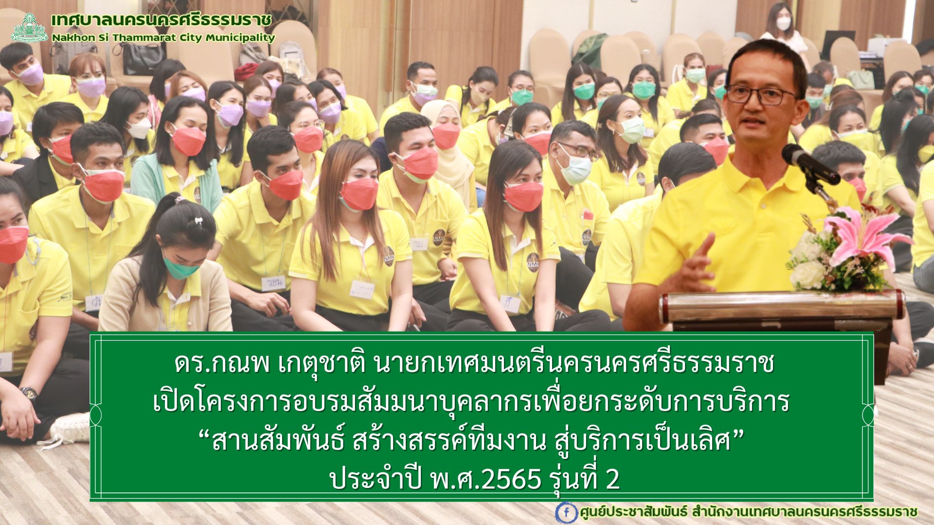 นายกเทศมนตรีนครนครศรีธรรมราช เปิดโครงการอบรมสัมมนาบุคลากรเพื่อยกระดับการบริการ “สานสัมพันธ์ สร้างสรรค์ทีมงาน สู่บริการเป็นเลิศ” ประจำปี พ.ศ.2565 (รุ่นที่ 2) |