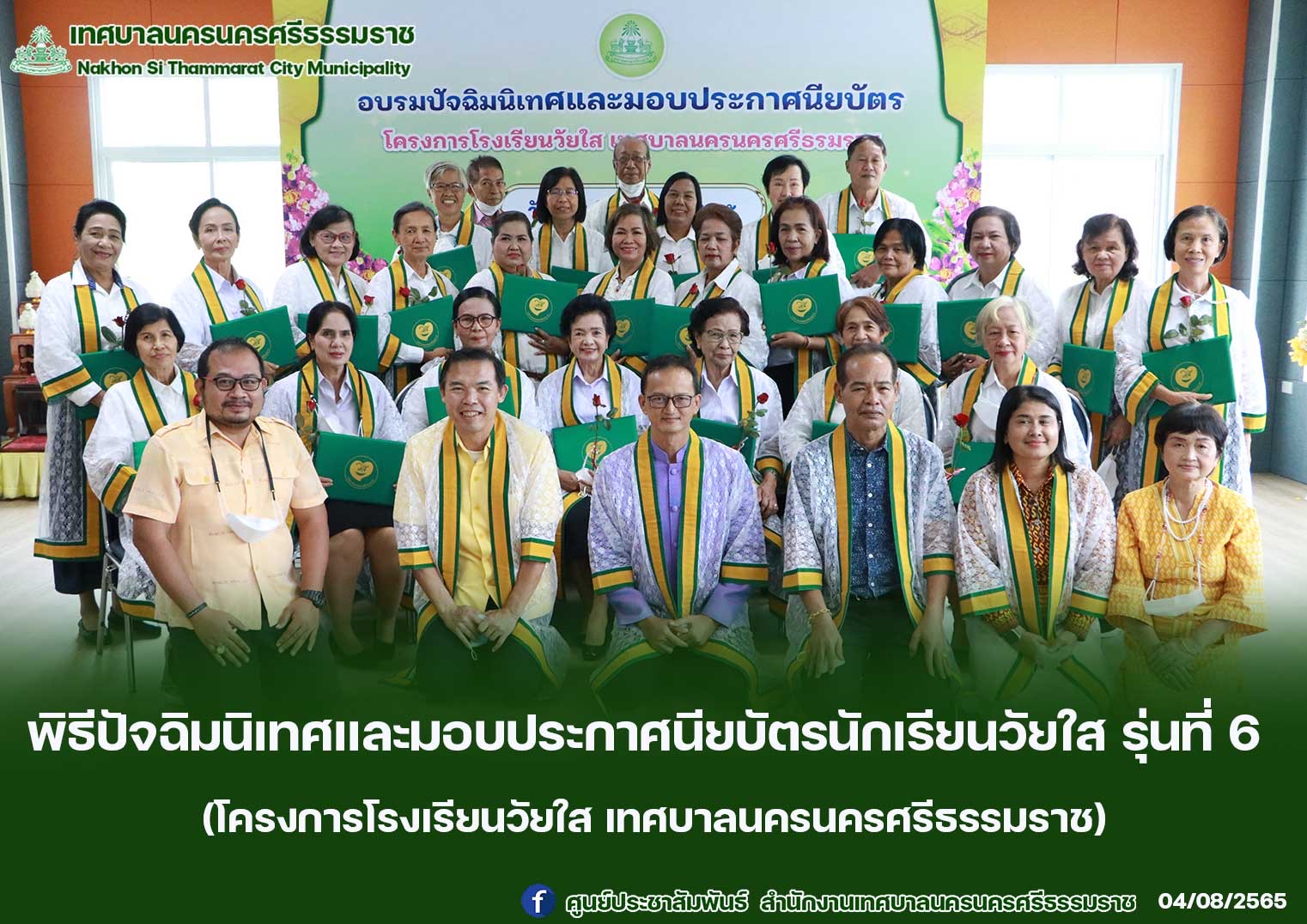 วันพฤหัสบดี ที่ 4 สิงหาคม 2565 เวลา 08.30 น. ณ ห้องประชุมมวลชนสัมพันธ์ กองสวัสดิการสังคม ดร.กณพ เกตุชาติ นายกเทศมนตรีนครนครศรีธรรมราช เป็นประธานในพิธีปัจฉิมนิเทศและมอบประกาศนียบัตรนักเรียนวัยใส รุ่นที่ 6 แก่ผู้สำเร็จการอบรมโครงการโรงเรียนวัยใส และโครงการโรงเรียนวัยใส มีวัตถุประสงค์เพื่อส่งเสริมการเรียนรู้ตลอดชีวิตให้กับผู้สูงอายุในรูปแบบของโรงเรียนวัยใส โดยจัดกิจกรรมการเรียนให้กับผู้สูงอายุ หลักสูตร120 ชั่วโมง ใช้เวลาเรียนประมาณ 3 เดือน จำนวนผู้เรียนรุ่นละ 30-35 คน สำหรับนักเรียนวัยใส รุ่นที่ 6 มีผู้เรียนจำนวน 33 คน เริ่มตั้งแต่วันที่15 ธันวาคม 2563 - วันที่ 28 เมษายน 2564 ตามหลักสูตร โดยมีครูผู้สอนจำนวน 7 ท่าน และมีผู้สำเร็จการอบรโครงการโรงเรียนวัยใส รุ่นที่6 จำนวนรวม 33 คน (ชาย 4 คน / หญิง 29 คน)