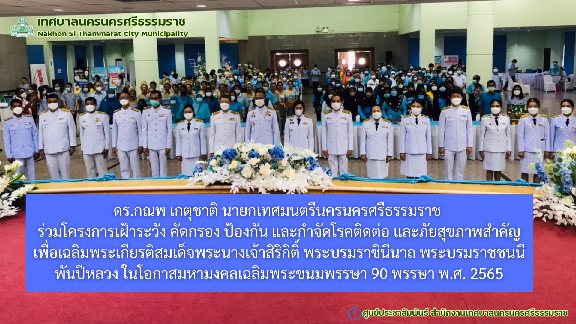 วันจันทร์ ที่ 8 สิงหาคม 2565 เวลา 08.30 น. ณ ศาลาประชาคมโรงละคร อำเภอเมือง จังหวัดนครศรีธรรมราช ดร.กณพ เกตุชาติ นายกเทศมนตรีนครนครศรีธรรมราช ร่วมโครงการเฝ้าระวัง คัดกรอง ป้องกัน และกำจัดโรคติดต่อ และภัยสุขภาพสำคัญ เพื่อเฉลิมพระเกียรติสมเด็จพระนางเจ้าสิริกิติ์ พระบรมราชินีนาถ พระบรมราชชนนีพันปีหลวงในโอกาสมหามงคลเฉลิมพระชนมพรรษา 90 พรรษา พ.ศ. 2565 ทั้งนี้มี นางเรืองอุไร บุญช่วยชูพันธุ์ รองผู้ว่าราชการจังหวัด เป็นประธานในพิธี
