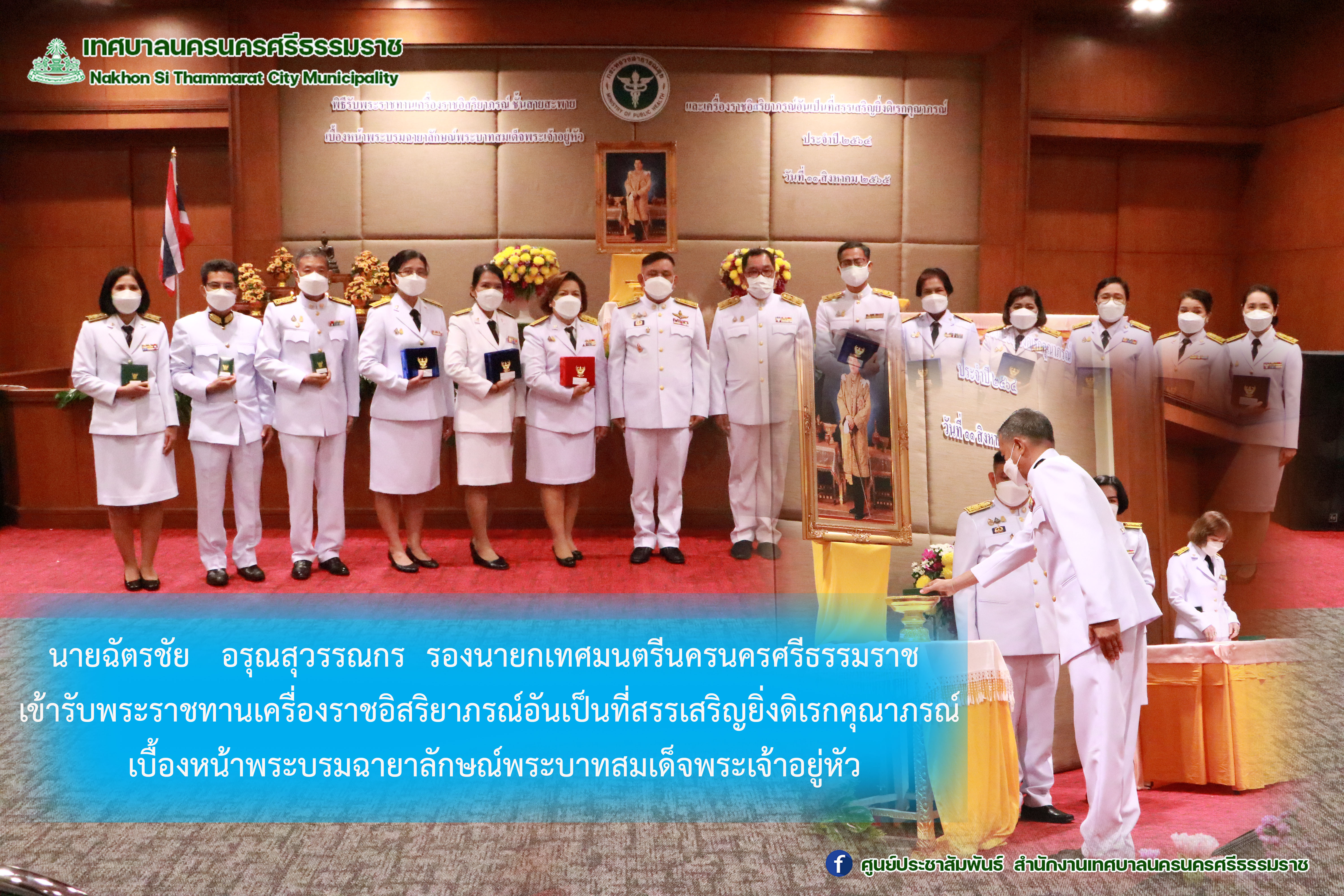 วันพฤหัสบดีที่ 11 สิงหาคม 2565 เวลา 09.00 น. ณ ห้องประชุม ชั้น 9 อาคารอำนวยการและผู้ป่วยนอก โรงพยาบาลมหาราชนครศรีธรรมราช นายฉัตรชัย อรุณสุวรรณกร รองนายกเทศมนตรีนครนครศรีธรรมราช เข้ารับพระราชทานเครื่องราชอิสริยาภรณ์อันเป็นที่สรรเสริญยิ่งดิเรกคุณาภรณ์ เบื้องหน้าพระบรมฉายาลักษณ์พระบาทสมเด็จพระเจ้าอยู่หัว ภาพ//ข่าวไกรสิทธิ |