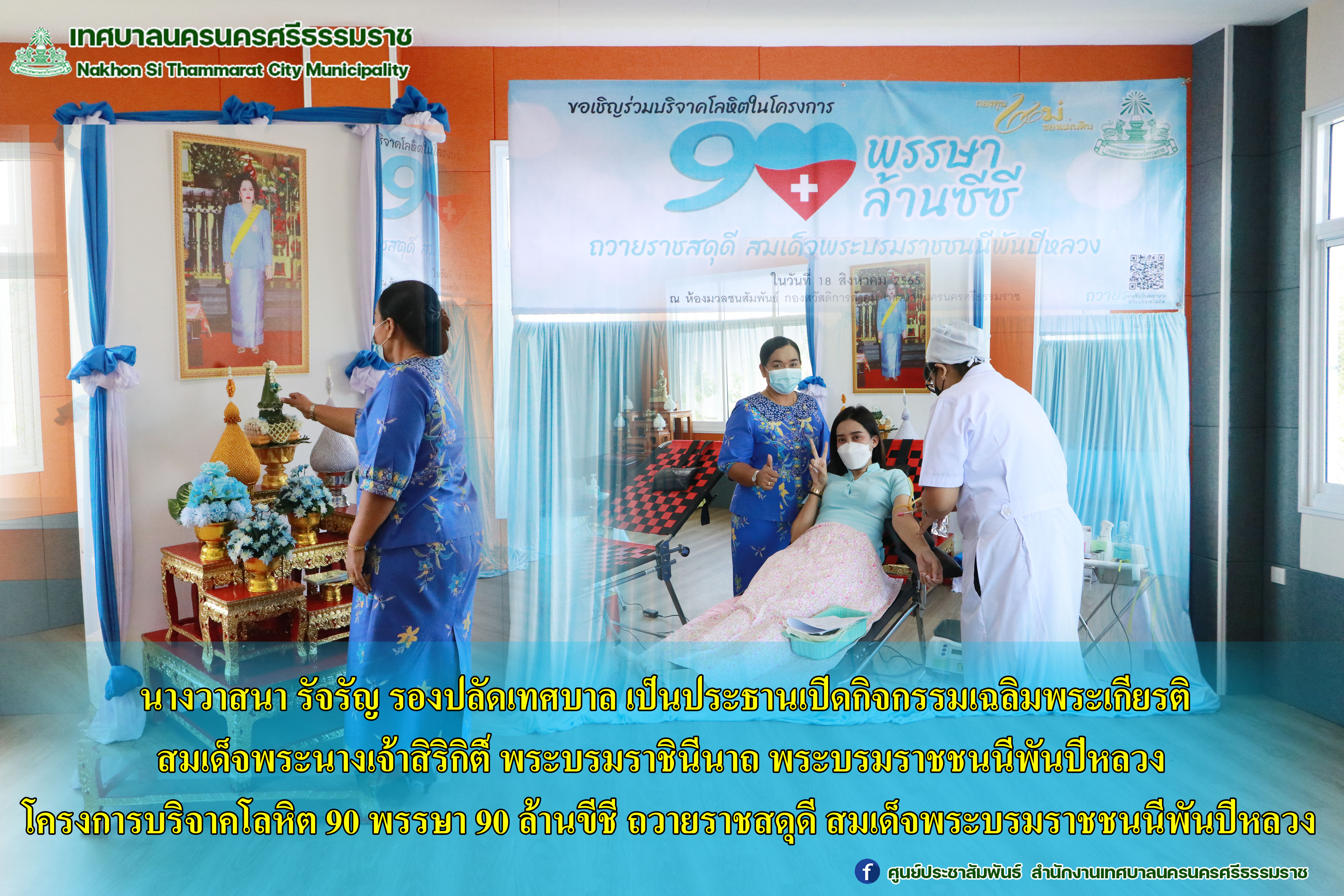วันพฤหัสบดี ที่ 18 สิงหาคม 2565 เวลา 09.00 น. ณ ห้องมวลชนสัมพันธ์ กองสวัสดิการสังคม (ทุ่งท่าลาด) นางวาสนา รัจรัญ รองปลัดเทศบาล เป็นประธานเปิดกิจกรรมเฉลิมพระเกียรติ สมเด็จพระนางเจ้าสิริกิติ์ พระบรมราชินีนาถ พระบรมราชชนนี พันปีหลวง โครงการบริจาคโลหิต 90 พรรษา 90 ล้านขีชี ถวายราชสดุดี สมเด็จพระบรมราชชนนีพันปีหลวง เนื่องในโอกาสมหามงคลเฉลิมพระชนมพรรษา 90 พรรษา 12 สิงหาคม 2565