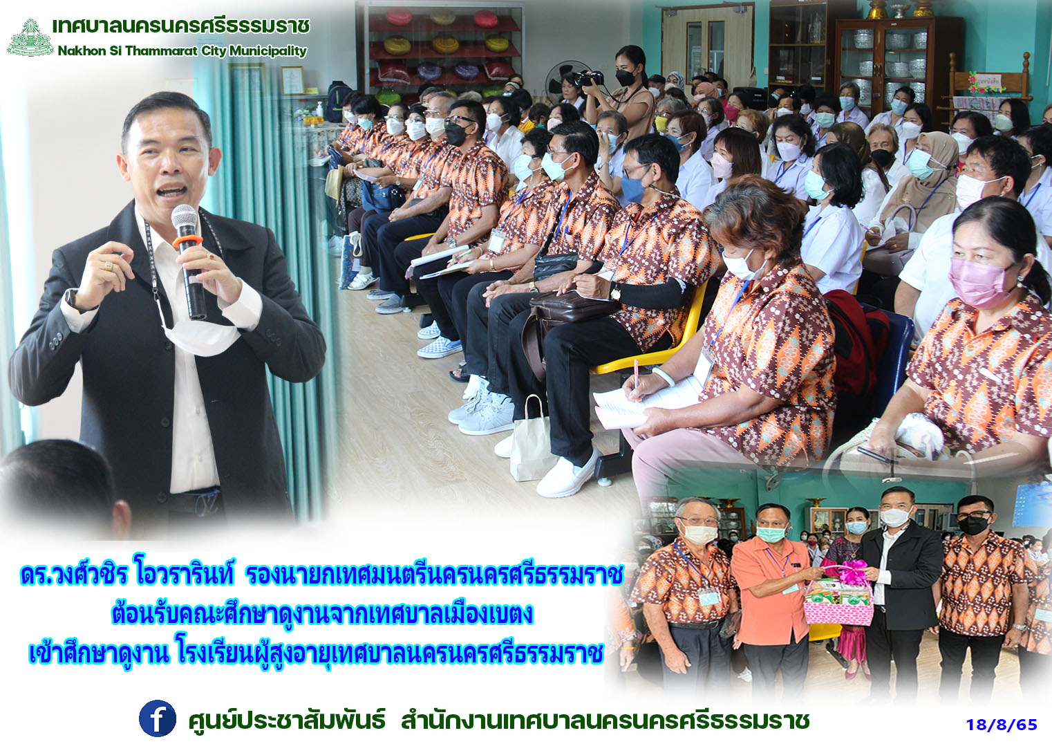 วันพฤหัสบดีที่ 18 สิงหาคม พ.ศ. 2565 เวลา 14.00 น. ณ กองสวัสดิการสังคม เทศบาลนครนครศรีธรรมราช ดร.วงศ์วชิร โอวรารินท์ รองนายกเทศมนตรีนครนครศรีธรรมราช ต้อนรับคณะศึกษาดูงานจากเทศบาลเมืองเบตง เข้าศึกษาดูงาน โรงเรียนผู้สูงอายุเทศบาลนครนครศรีธรรมราช ตามโครงการพัฒนาคุณภาพชีวิตผู้สูงอายุ โดยมีวัตถุประสงค์ เพื่อให้ผู้สูงอายุมีความรู้ ความเข้าใจในการปฏิบัติตนลดภาวการณ์เกิดโรค รู้จักปรับเปลี่ยนพฤติกรรมในการดูแลสุขภาพ ทราบถึงกฎหมาย สิทธิและสวัสดิการของผู้สูงอายุและสามารถนำปรัชญาเศรษฐกิจพอเพียงเป็นแนวทางในการดำเนินชีวิต เกิดการพัฒนาความคิดในการสร้างงาน สร้างอาชีพที่เหมาะสมให้กับตนเองรวมถึงส่งเสริมการเรียนรู้ เกิดการรวมกลุ่มของผู้สูงอายุในการทำกิจกรรมด้านต่างๆ