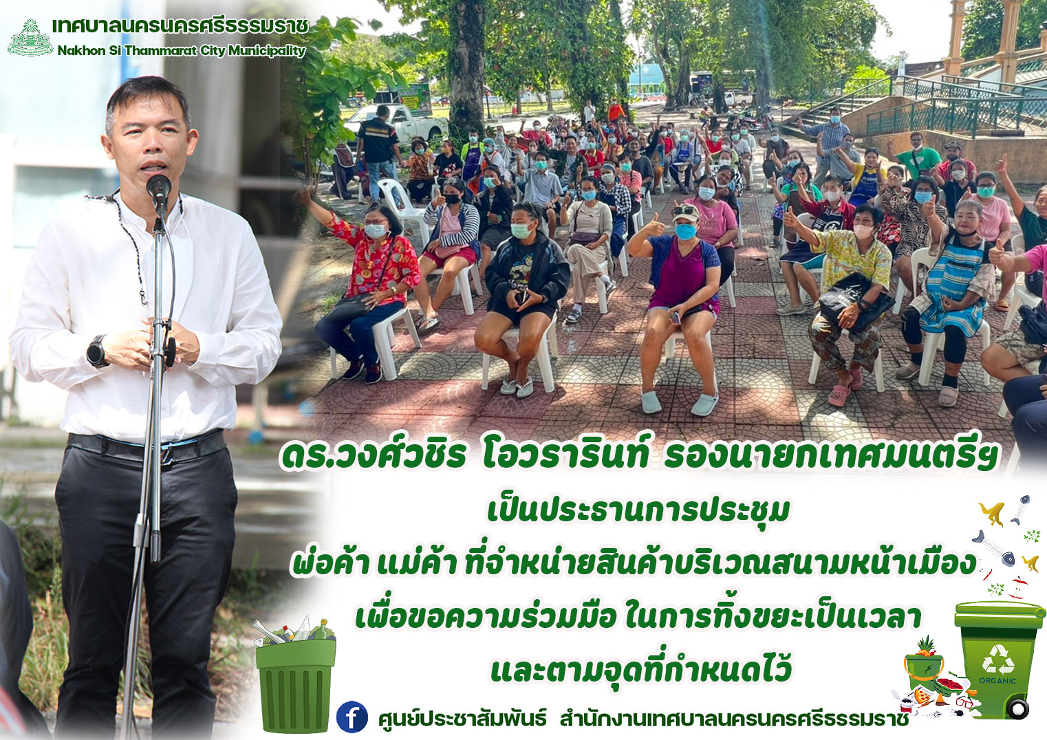 ดร.วงศ์วชิร โอวรารินท์ รองนายกเทศมนตรีนครนครศรีธรรมราช เป็นประธานการประชุม พ่อค้า แม่ค้า ที่จำหน่ายสินค้าบริเวณสนามหน้าเมือง เพื่อขอความร่วมมือ ในการทิ้งขยะเป็นเวลา และตามจุดที่กำหนดไว้ ตามโครงการถนนปลอดถัง ( ขยะ ) |
