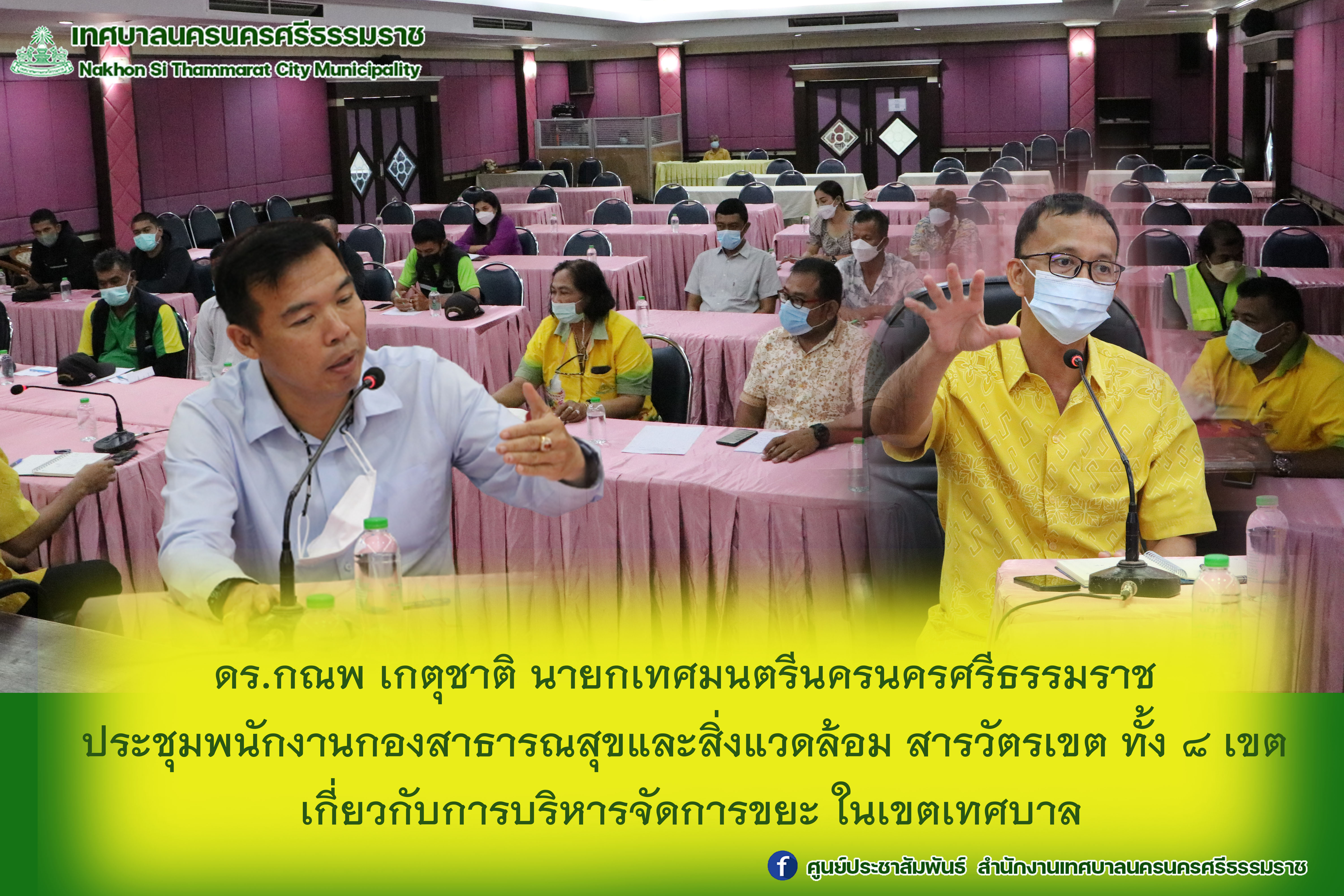 วันพุธ ที่ 31 สิงหาคม 2565 เวลา 14.00 น. ณ ห้องประชุมสำนักงานเทศบาลนครนครศรีธรรมราช ชั้น 5 ดร.กณพ เกตุชาติ นายกเทศมนตรีนครนครศรีธรรมราช พร้อมด้วย ดร.วงศ์วชิร โอวรารินท์ รองนายกเทศมนตรีนครนครศรีธรรมราช ประชุมพนักงานกองสาธารณสุขและสิ่งแวดล้อม สารวัตรเขตตรวจงาน ทั้ง 8 เขต เพื่อรับฟังปัญหา พร้อมมอบนโยบายเกี่ยวกับการจัดเก็บขยะ และจุดทิ้งถุงดำ ในเขตเทศบาลนครนครศรีธรรมราช