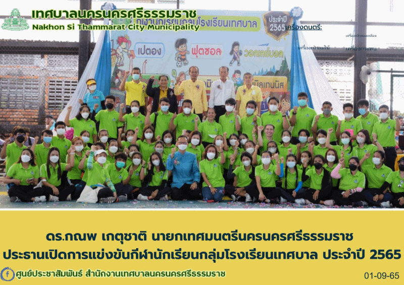 วันพฤหัสบดี ที่1 กันยายน 2565 เวลา 09.00 น. ดร.กณพ เกตุชาติ นายกเทศมนตรีนครนครศรีธรรมราช เป็นประธานในพิธีเปิดการแข่งขันกีฬานักเรียนกลุ่มโรงเรียนเทศบาล ประจำปี 2565 ณ สนามฟุตซอลเทศบาลนครนครศรีธรรมราช นายชาคร ไอยศูรย์ ปลัดเทศบาล กล่าวรายงานต่อประธานในพิธี ถึงวัตถุประสงค์การจัดการแข่งขันกีฬานักเรียนประกอบด้วย โรงเรียนในสังกัด 9 แห่ง ซึ่งจัดขึ้นระหว่างวันที่ 1-10 กันยายน 2565 ประกอบด้วยกีฬา 6 ประเภท ดังนี้