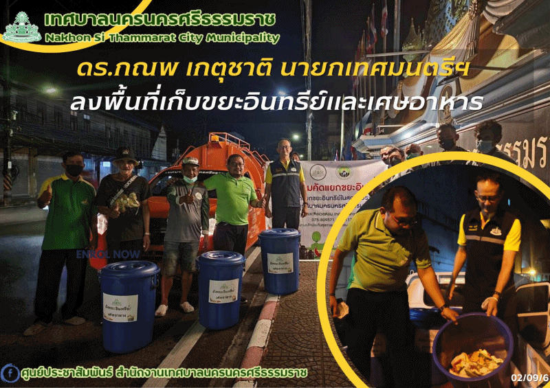 วันศุกร์ ที่ 2 กันยายน 2565 เวลา 20.30 น. ดร.กณพ เกตุชาติ นายกเทศมนตรีนครนครศรีธรรมราช พร้อมด้วยคณะผู้บริหาร หัวหน้าส่วนราชการ และเจ้าหน้าที่ เทศบาลนครนครศรีธรรมราช ลงพื้นที่ ห้างสรรพสินค้า โรงแรม สถานประกอบการต่างๆ ภายในเขตเทศบาลฯ เพื่อดำเนินการจัดเก็บขยะอินทรีย์ หรือ ขยะเปียก และนำไปทิ้งที่จุดบำบัดขยะเปียก ที่ได้จัดเตรียมไว้ บริเวณสวนสาธารณะสวนสมเด็จพระศรีนครินทร์ 84 (ทุ่งท่าลาด) เพื่อเป็นแนวทางในการบริหารจัดการขยะที่ถูกต้องต่อไป |