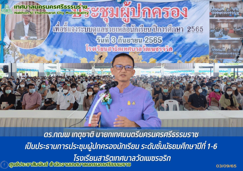 วันเสาร์ ที่3 กันยายน พ.ศ.2565 เวลา 09.00 น. ดร.กณพ เกตุชาติ นายกเทศมนตรีนครนครศรีธรรมราช เป็นประธานการประชุมผู้ปกครองนักเรียนโรงเรียนสาธิตเทศบาลวัดเพชรจริก ประจำปีการศึกษา 2565 พร้อมด้วยผู้บริหาร หัวหน้าส่วนราชการ ผู้บริหารสถานศึกษา ณ โดมโรงเรียนสาธิตเทศบาลวัดเพชรจริก