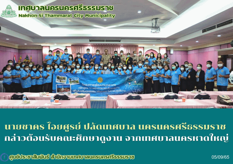 วันจันทร์ ที่5 กันยายน 2565 เวลา 13.00 น. ณ ห้องประชุมเทศบาลนครนครศรีธรรมราช ชั้น5 นายชาคร ไอยศูรย์ ปลัดเทศบาล กล่าวต้อนรับคณะศึกษาดูงานจากเทศบาลนครหาดใหญ่ พร้อมด้วยหัวหน้าส่วนราชการ โดยจัดโครงการพัฒนาบุคลากร หลักสูตร "การฝึกอบรมและศึกษาดูงาน เพื่อส่งเสริมคุณธรรมจริยธรรม ในการปฏิบัติงาน ประจำปีงบประมาณ 2565" เพื่อส่งเสริมให้ผู้เข้าร่วมฝึกอบรม มีความรู้ มีความเข้าใจ และยึดมั่นในหลักคุณธรรมจริยธรรมกลักธรรมาภิบาลและการบริหารกิจการบ้านเมืองที่ดี .................... ภาพ//ข่าว//จันทร์จิรา |