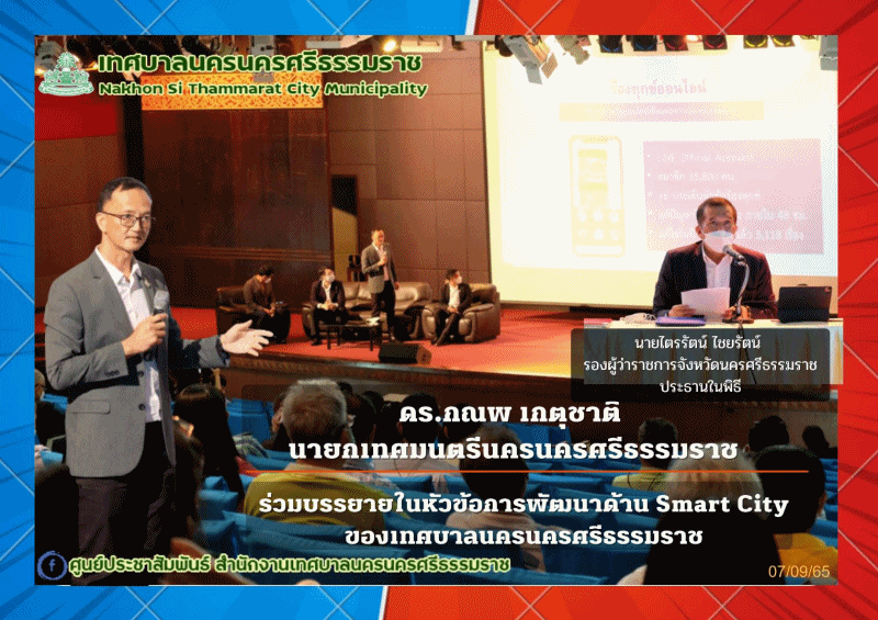 ดร.กณพ เกตุชาติ นายกเทศมนตรีนครนครศรีธรรมราช ร่วมบรรยายในหัวข้อการพัฒนาด้าน Smart City ของเทศบาลนครนครศรีธรรมราช |