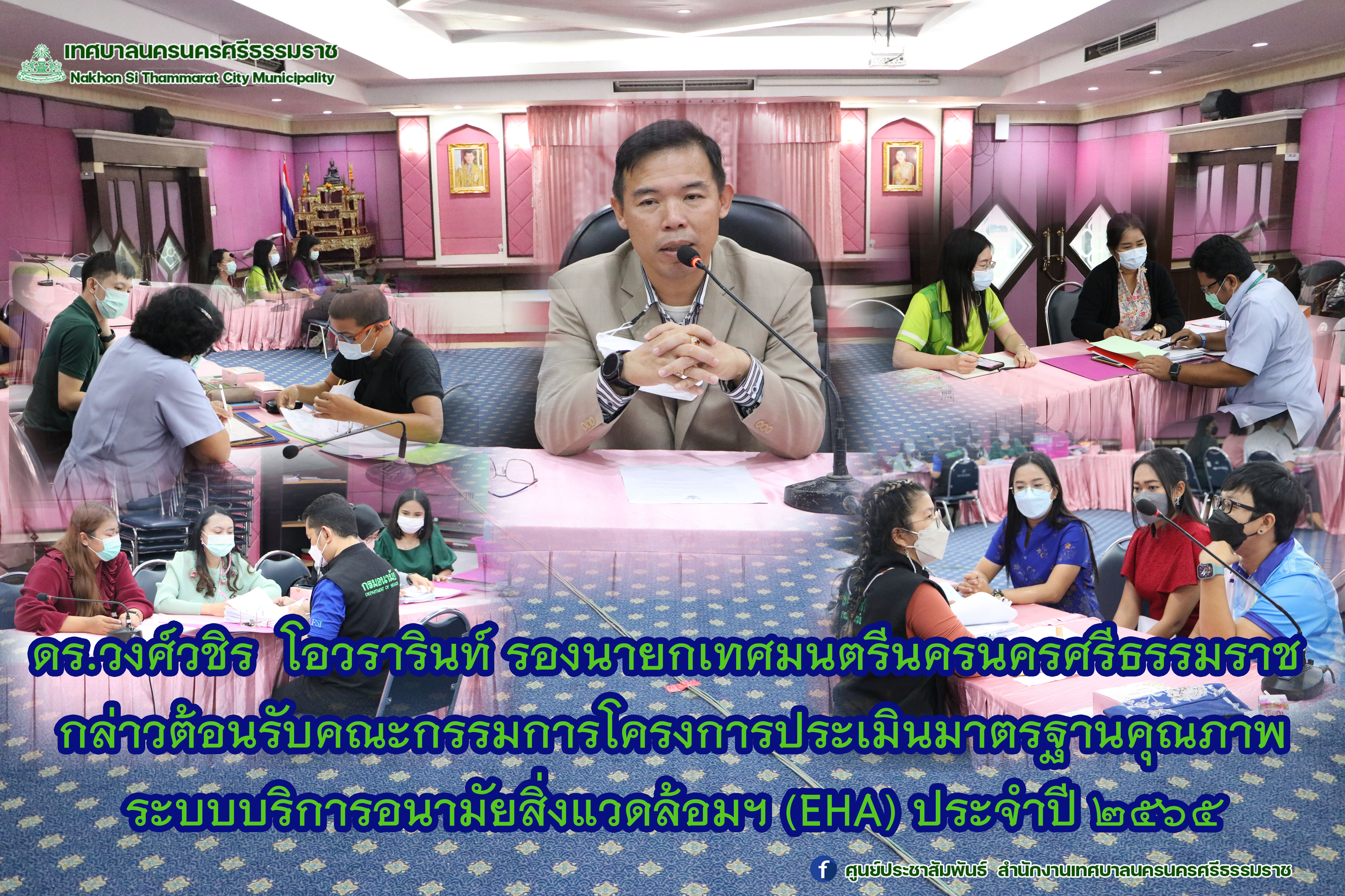 วันพฤหัสบดี ที่ 8 กันยายน 2565 เวลา 09.00 น. ณ ห้องประชุมสำนักงานเทศบาลนครนครศรีธรรมราช (ชั้น 5) ดร.วงศ์วชิร โอวรารินท์ รองนายกเทศมนตรีนครนครศรีธรรมราช กล่าวต้อนรับคณะกรรมการโครงการประเมินมาตรฐานคุณภาพระบบบริการอนามัยสิ่งแวดล้อมฯ (EHA) ประจำปี 2565 จากสำนักงานสาธารณสุขจังหวัดนครศรีธรรมราช ซึ่งโครงการนี้มุ่งเน้นส่งเสริมสนับสนุนและพัฒนาศักยภาพขององค์กรปกครองส่วนท้องถิ่น เพื่อให้มีการพัฒนาคุณภาพมาตรฐานคุณภาพระบบบริการอนามัยสิ่งแวดล้อมอย่างมีส่วนร่วม
