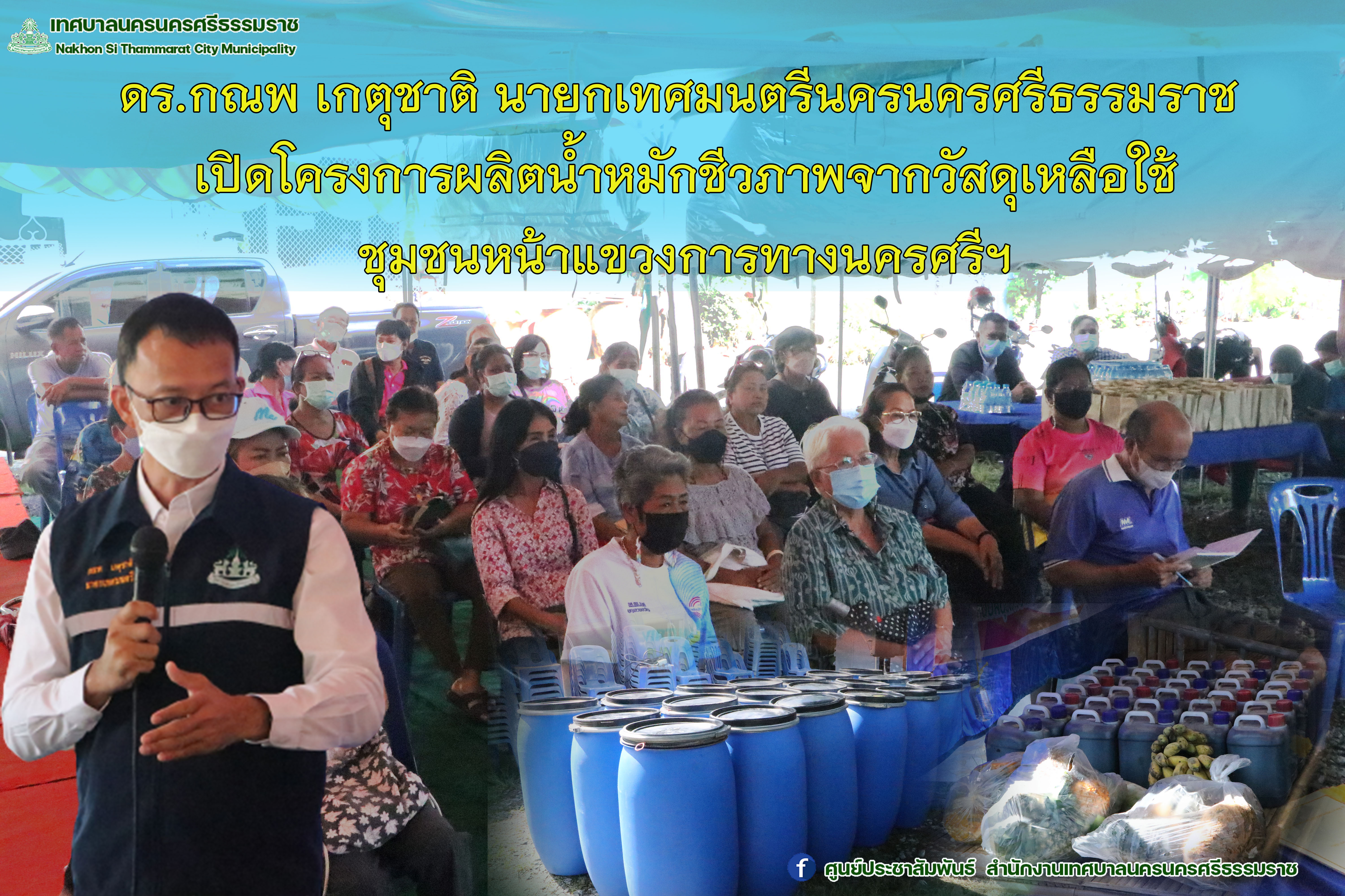 วันอังคาร ที่ 13 กันยายน 2565 เวลา 09.00 น. ณ ที่ทำการชุมชนหน้าแขวงการทางนครศรีฯ ดร.กณพ เกตุชาติ นายกเทศมนตรีนครนครศรีธรรมราช เป็นประธานเปิดโครงการผลิตน้ำหมักชีวภาพจากวัสดุเหลือใช้ชุมชนหน้าแขวงการทางนครศรีฯ เพื่อให้ประชาชนมีความรู้เกี่ยวกับการทำปุ๋ยชัวภาพ และเพื่อลดปริมาณขยะอินทรีย์ และลดปัญหามลพิษในชุมชน