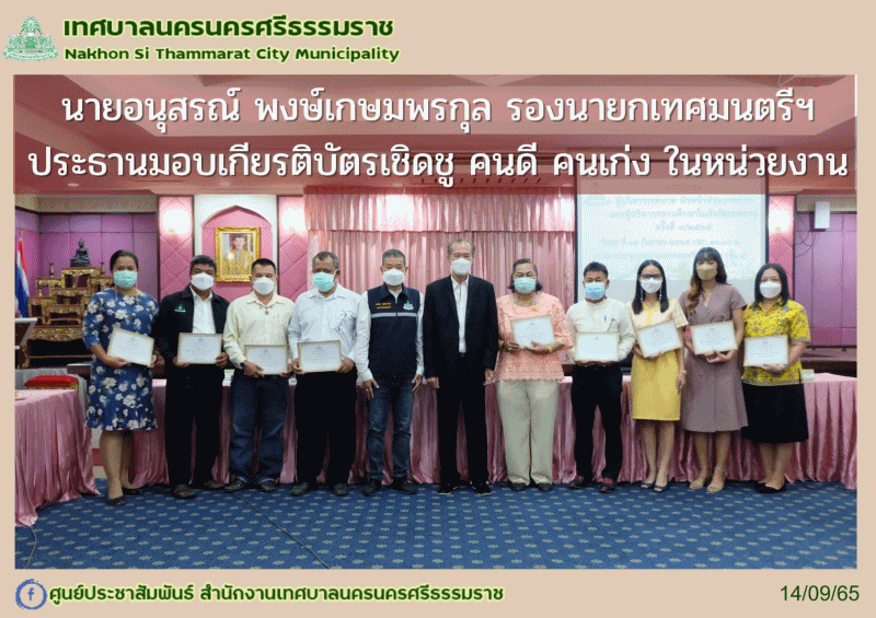 วันพุธ ที่14 กันยายน 2565 เวลา 10.00 น. ณ ห้องประชุมเทศบาลนครนครศรีธรรมราช ชั้น5 นายอนุสรณ์ พงษ์เกษมพรกุล รองเทศมนตรีนครนครศรีธรรมราช เป็นประธานมอบเกียรติบัตร “กิจกรรมเชิดชู คนดี คนเก่ง ในหน่วยงาน” พร้อมด้วยผู้บริหาร หัวหน้าส่วนราชการ ผู้บริหารสถานศึกษาในสังกัดเทศบาล กิจกรรมในครั้งนี้จัดขึ้นเพื่อยกย่องเชิดชูเกียรติบุคลากรในสังกัดที่มีความประพฤติตนเป็นคนดี มีความรู้ความสามารถ และเป็นการสร้างแบบอย่างที่ดีต่อการประพฤติปฏิบัติตนเป็นคนดี คนเก่งต่อบุคลากรในหน่วยงาน และเป็นการสนับสนุนให้มีผู้ประพฤติตนเป็นคนดีคนเก่งในหน่วยงานเพิ่มมากขึ้น โดยมีผู้เข้ารับเกียรติบัตร ดังนี้