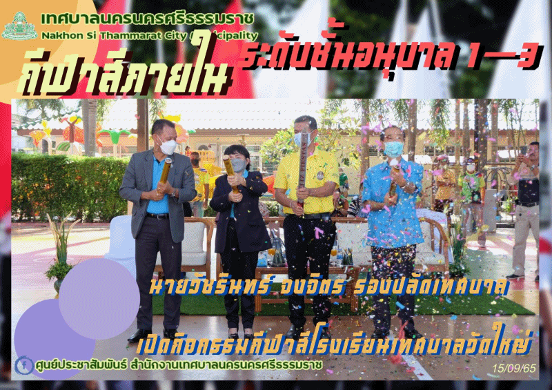 นายวัชรินทร์ จงจิตร รองปลัดเทศบาล นครนครศรีธรรมราช ประธานพิธีเปิดการแข่งขันกีฬาสี ระดับชั้นอนุบาล 1-3 ประจำปีการศึกษา 2565 |
