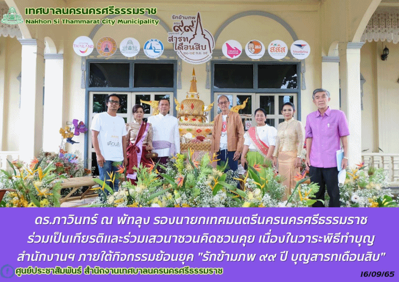ดร.ภาวินทร์ ณ พัทลุง รองนายกเทศมนตรีนครนครศรีธรรมราช ร่วมเสวนาชวนคิดชวนคุย เนื่องในวาระพิธีทำบุญสำนักงานฯ ภายใต้กิจกรรมย้อนยุค “รักข้ามภพ ๙๙ ปี บุญสารทเดือนสิบ” |