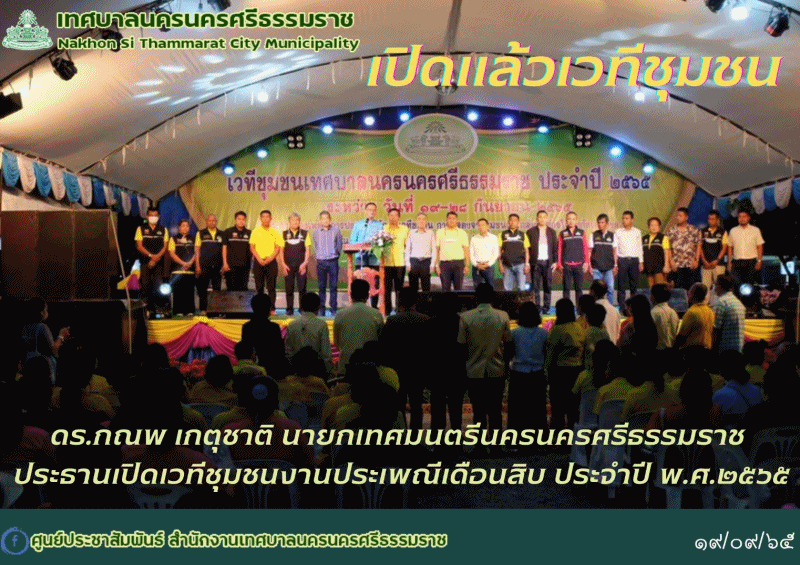วันจันทร์ ที่๑๙ กันยายน ๒๕๖๕ ณ สวนสมเด็จพระศรีนครินทร์’๘๔ (ทุ่งท่าลาด) ดร.กณพ เกตุชาติ นายกเทศมนตรีนครนครศรีธรรมราช ประธานเปิดเวทีชุมชนประเพณีเดือนสิบ ประจำปี พ.ศ.๒๕๖๕ พร้อมด้วยผู้บริหาร หัวหน้าส่วนราชการ สมาชิกสภาเทศบาล พนักงานเทศบาล และประธานคณะกรรมการชุมชน ทั้ง ๖๗ ชุมชน |