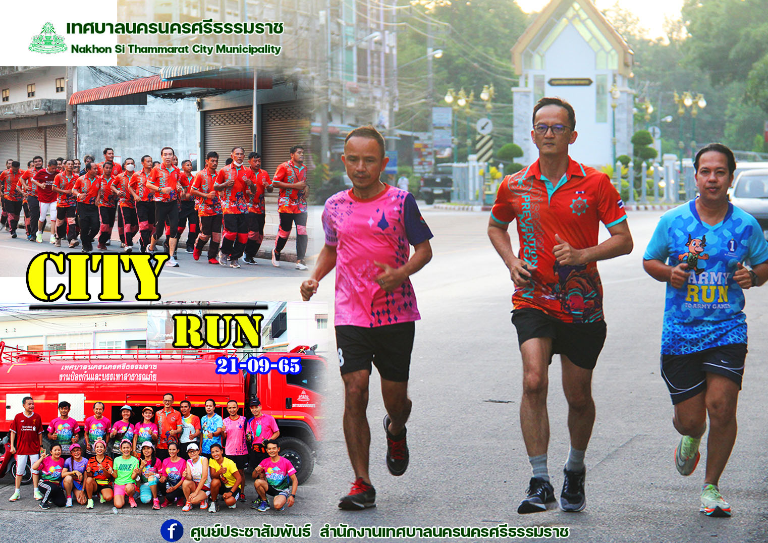 วันพุธ ที่ 21 กันยายน 2565 เวลา 05.30 น. ดร.กณพ เกตุชาติ นายกเทศมนตรีนครนครศรีธรรมราช พร้อมด้วย นายฉัตรชัย อรุณสุวรรณกร รองนายกเทศมนตรีนครนครศรีธรรมราช นายยงยุทธ เหล่าเจริญเกียรติ หัวหน้าฝ่ายป้องกันและบรรเทาสาธารณภัย สมาชิกสภาเทศบาลนครนครศรีธรรมราช และเจ้าหน้าที่ป้องกันและบรรเทาสาธารณภัย ประชาชนทั่วไป วิ่งออกกำลังกาย "city run " ทุกวันพุธ โดยเริ่มจาก หน้าหมู่บ้านเอื้ออาทรสะพานยาว ผ่านเส้นทางวงเวียนนอกไร่ ผ่านโรงเรียนไตรภูมิวิทยา ออกไปยังถนนกะโรมผ่านหน้าตลาดหัวอิฐ เลี้ยวซ้ายผ่านชุมชนบ้านตก มายังถนนยมราช ผ่านหน้าสถานีรถไฟ เข้าสู่ถนนสะพานยาว กลับมายังจัดเดิม ระยะทาง ไป - กลับ 5กิโลเมตร |