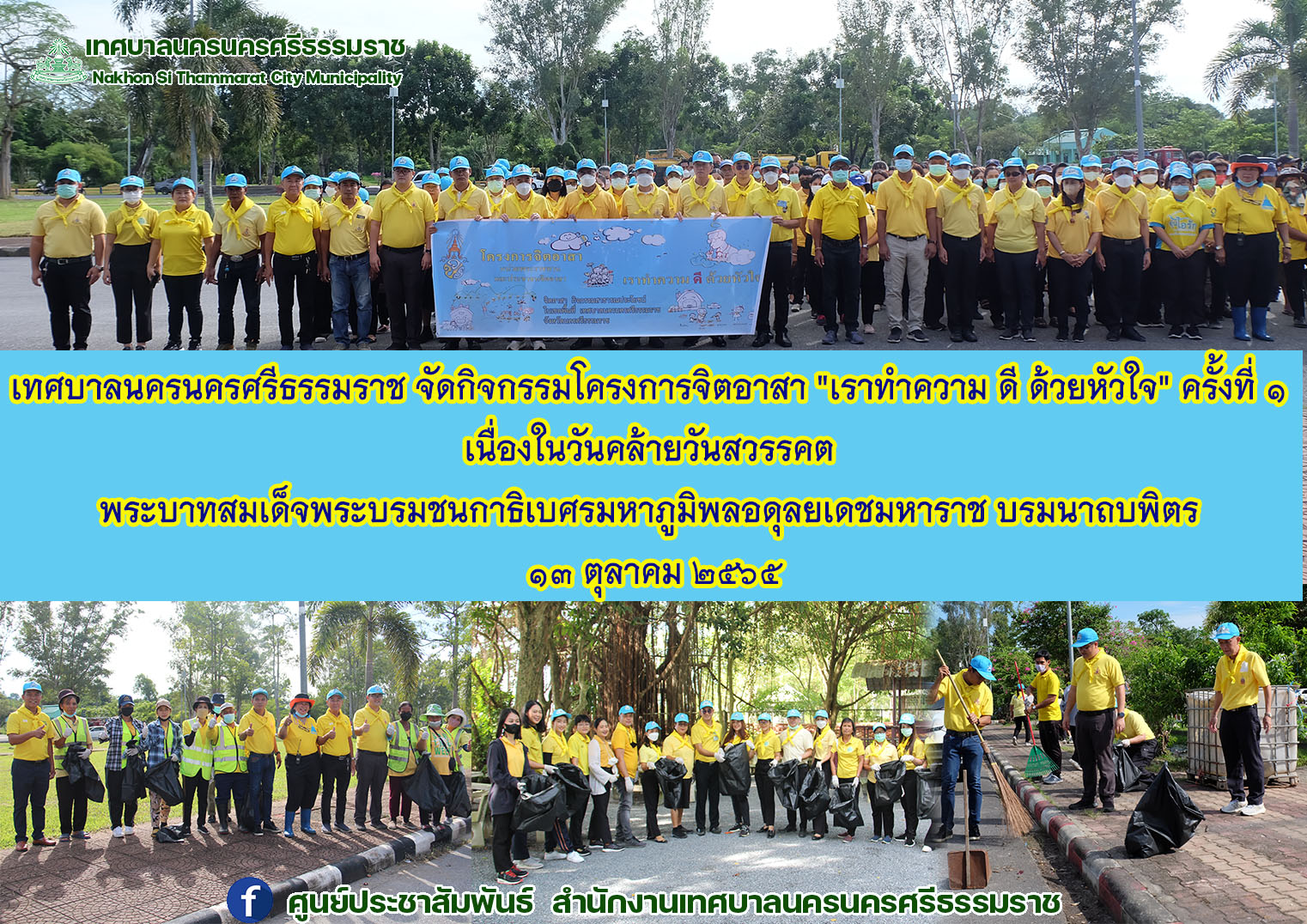 เทศบาลนครนครศรีธรรมราช จัดกิจกรรมโครงการจิตอาสา "เราทำความ ดี ด้วยหัวใจ" ครั้งที่ 1 เนื่องในวันคล้ายวันสวรรคต พระบาทสมเด็จพระบรมชนกาธิเบศร มหาภูมิพลอดุลยเดชมหาราช บรมนาถบพิตร 13 ตุลาคม 2565 |