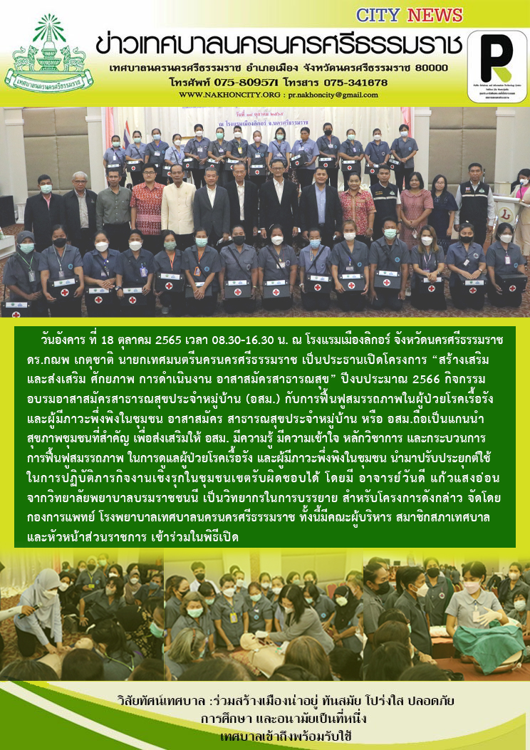 วันอังคาร ที่ 18 ตุลาคม 2565 เวลา 08.30-16.30 น. ณ โรงแรมเมืองลิกอร์ ดร.กณพ เกตุชาติ นายกเทศมนตรีนครนครศรีธรรมราช เป็นประธานเปิดโครงการ “สร้างเสริมและส่งเสริมศักยภาพการดำเนินงานอาสาสมัครสาธารณสุข”ปีงบประมาณ 2566 กิจกรรม อบรม อาสาสมัครสาธารณสุข ประจำหมู่บ้าน (อสม.) กับ การฟื้นฟูสมรรถภาพในผู้ป่วยโรคเรื้อรัง และผู้มีภาวะพึ่งพิงในชุมชน อาสาสมัครสาธารณสุขประจำหมู่บ้าน หรือ อสม.ถือเป็น แกนนำสุขภาพชุมชน ที่สำคัญ เพื่อส่งเสริมให้ อสม. มีความรู้ มีความเข้าใจ หลักวิชาการ และกระบวนการการฟื้นฟูสมรรถภาพในการดูแลผู้ป่วยโรคเรื้อรัง และผู้มีภาวะพึ่งพิงในชุมชนนำมาปรับประยุกต์ใช้ในการปฏิบัติภารกิจงานเชิงรุกในชุมชนเขตรับผิดชอบได้ โดยมี อาจารย์วันดี แก้วแสงอ่อน จากวิทยาลัยพยาบาลบรมราชชนนนี เป็นวิทยากรในการบรรยาย สำหรับโครงการดังกล่าวจัดโดยกองการแพทย์ โรงพยาบาลเทศบาลนครนครศรีธรรมราช ทั้งนี้มีคณะผู้บริหาร สมาชิกสภาเทศบาล และหัวหน้าส่วนราชการ เข้าร่วมในพิธีเปิด