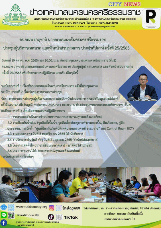 ดร.กณพ เกตุชาติ นายกเทศมนตรีนครนครศรีธรรมราช ประชุมผู้บริหารเทศบาล และหัวหน้าส่วนราชการ ประจำสัปดาห์ ครั้งที่ 25/2565 |
